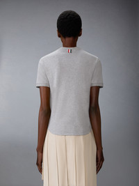 This tee is crafted in structured cotton with a soft hand and clean finish. The rounded hem and minimal chest pocket lend subtle shaping, while signature Thom Browne emblems bring clarity to an enduring staple. Pair with a pleated skirt and Collegiate Sneakers to echo classic campus codes. Ribbed neckline and cuffs Patch chest pocket Curved stepped hem Name tag applique Signature striped grosgrain loop tab Model is 5'10" (178 cm), wearing size 64 100% Cotton Combo 1: 97% Cotton, 3% Elastane Made in Italy FJS223A-J0055-055