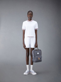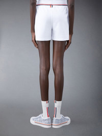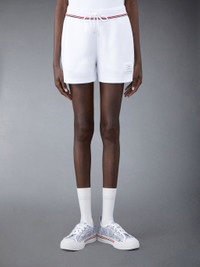 DETAILS & FIT Sweatshorts in white cotton Milano with stripe trim at waist. Drawstring ribbed waistband, name tag applique above left cuff. Slant side pockets. Signature striped grosgrain loop tab at back waist. Model is 5'10" (178 cm), wearing size 40 100% Cotton Combo 1: 97% Cotton, 3% Elastane Made in Italy FJQ099AJ0055100