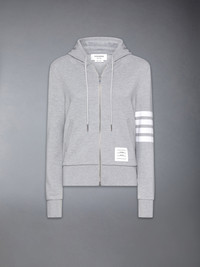 Zip-up hoodie in light grey ottoman rib with 4-bar stripe detail at left sleeve in white. 2-way zip front closure, drawstring hood with silver tone aglets, slant welt pockets. Name tag applique above hem. Signature striped grosgrain loop tab at back of neck. Model is 5'10"; (178 cm), wearing size 40 100% Cotton Made in Italy FJT205A-08138-055