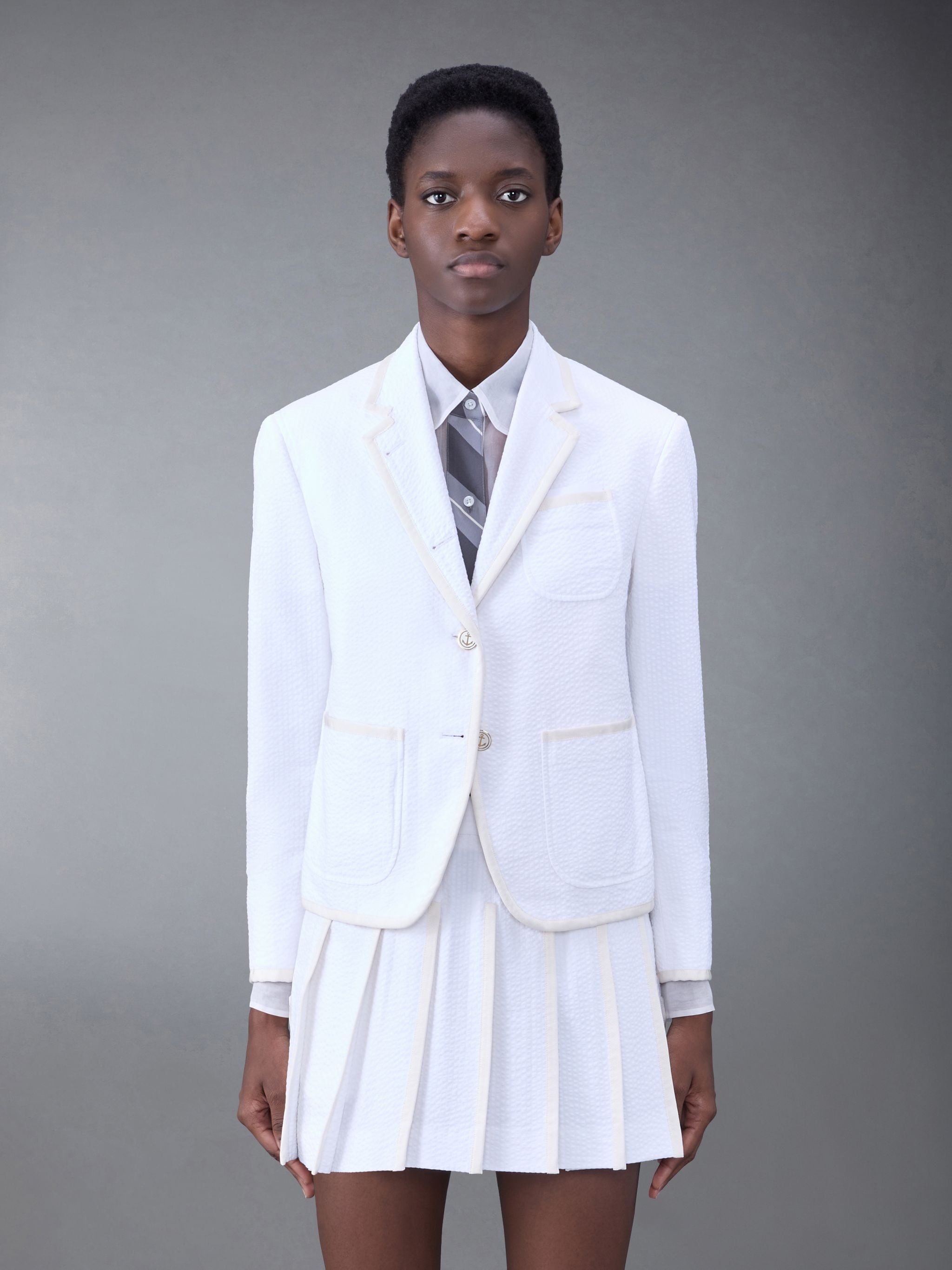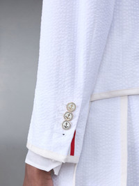 DETAILS & FIT Our Stiff Cotton Seersucker Shrunken Sack Tipping Sport Coat is a brilliant interpretation of our classic suit jacket, featuring contrasted grosgrain tipping trim and anchor buttons. Front button closure 3 patch pockets Buttoned cuffs with signature striped grosgrain trim Single back vent Striped lining with interior pockets and name tag Signature striped grosgrain loop tab Model is 5' 10" (178cm), wearing size 40 100% Cotton Lining: 100% Cupro Made in Italy FBR031B-F0592-100