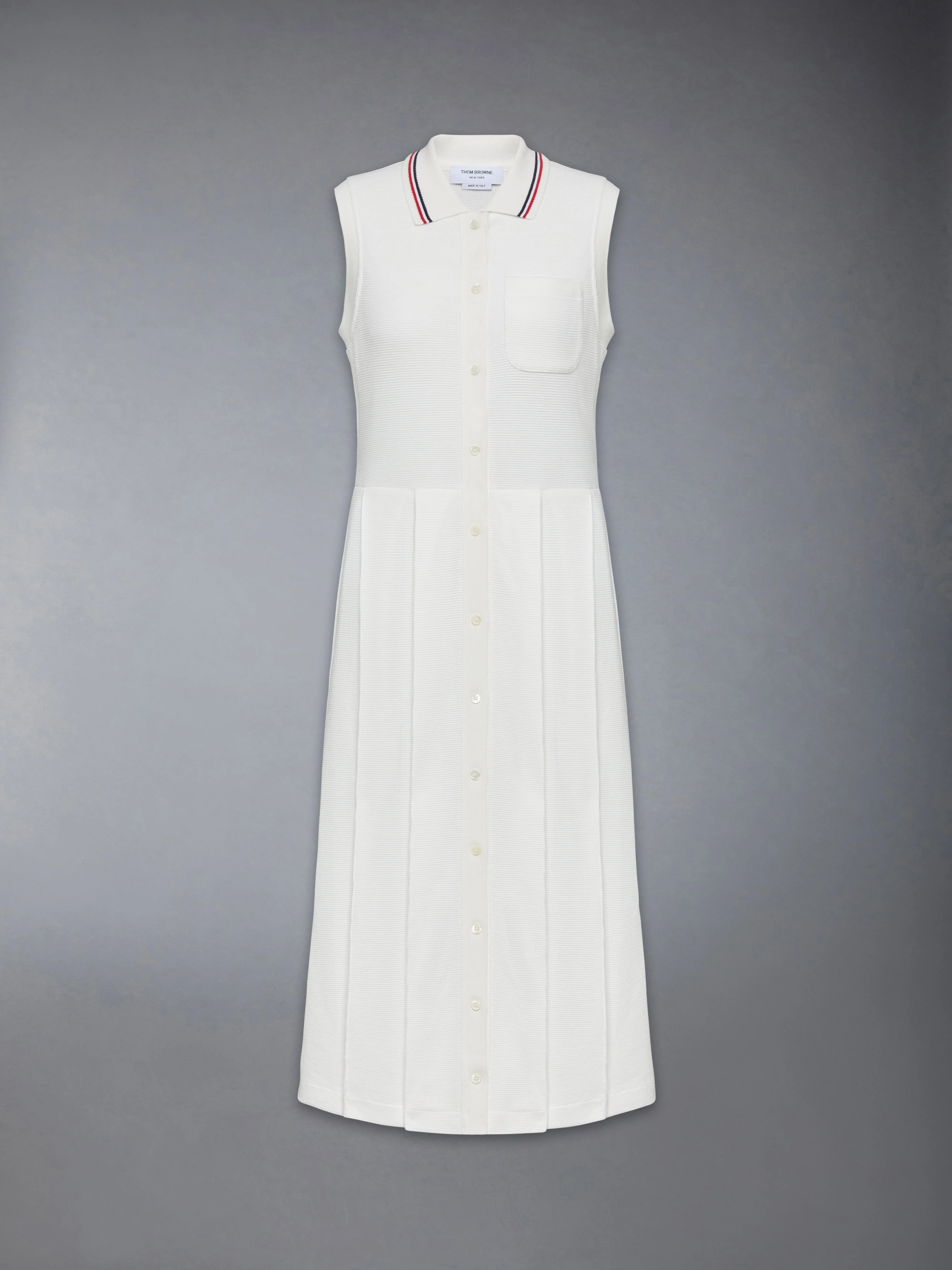 This breathable, lightweight polo dress is a tribute to revolutionary tennis player Suzanne Lenglen, who transformed women’s tennis attire with knee-length pleated skirts and cardigans, challenging the restrictive dress codes of her time. Her bold choices laid the foundation for today's iconic tennis aesthetic. This seasonal piece symbolizes independence, individuality, and timeless sophistication. Front button closure Chest patch pocket Name tag applique Signature striped grosgrain loop tab Model is 5'10" (178 cm), wearing size 40 100% Cotton Made in Italy FJD127A-J0216-113