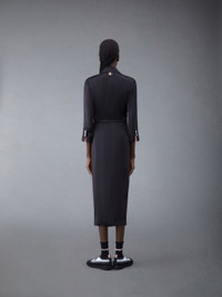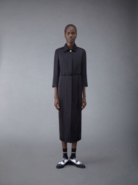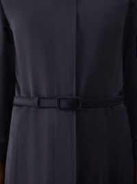DETAILS & FIT Calf length bal collar pencil dress in crepe back black satin with tonal self-belt at waist. Covered button placket, bal collar, 3/4 sleeves with buttoned cuffs. Signature striped grosgrain loop tab at back of neck. Model is 5'10" (178 cm), wearing size 40 100% Silk Made in Italy FDSE18UF0384001