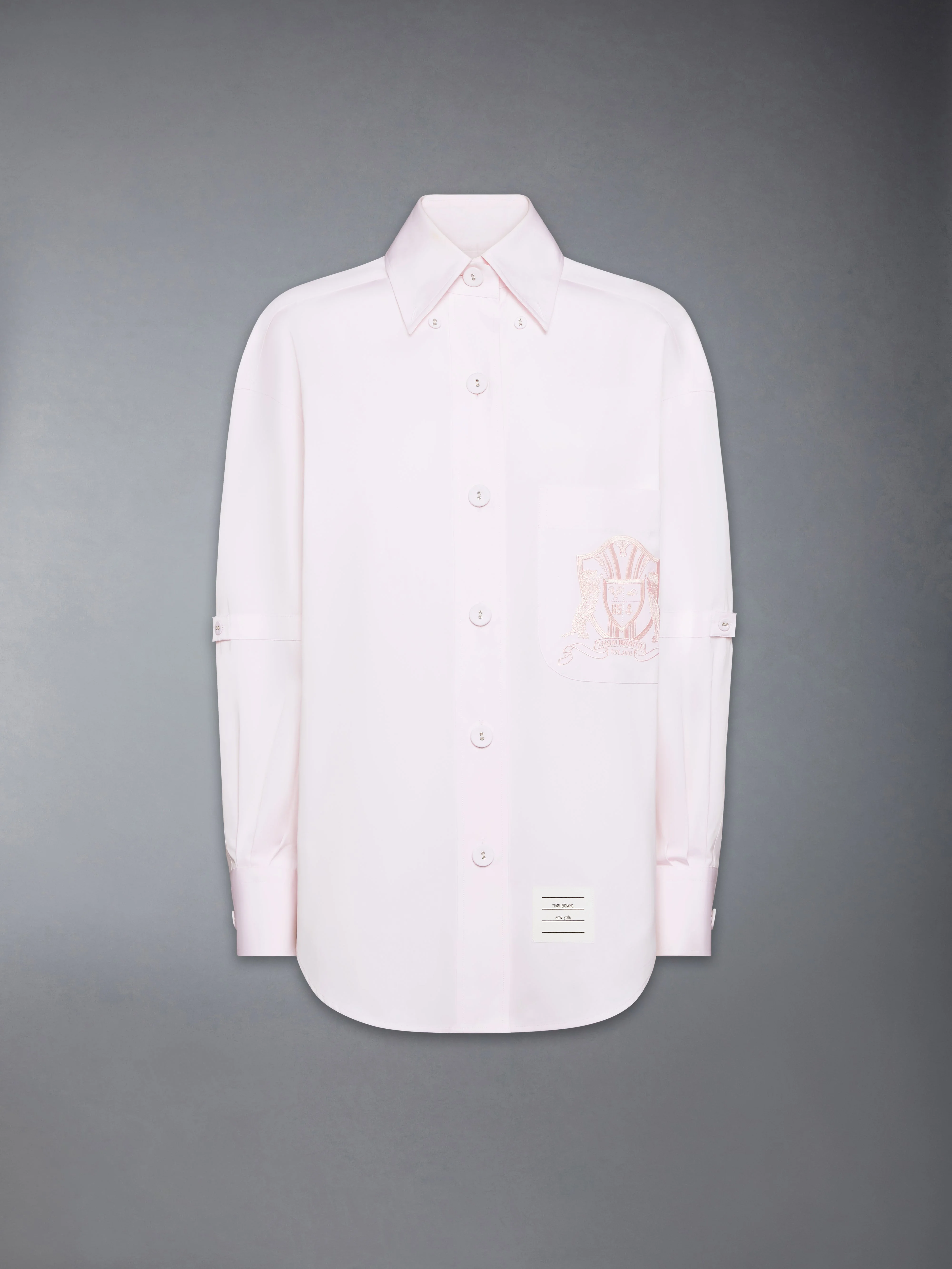 Cut in solid cotton poplin with a supersized silhouette and exaggerated point collar, this shirt features a tonal embroidered crest at the chest pocket—stitched in machine, running, and pencil techniques. Motifs including Hector, crossed tennis rackets, a swimmer, an anchor, and the number 65 come together in a quiet emblem of identity. The composition reflects Thom Browne’s dedication to craft, and his ongoing narrative of sport, discipline, and design. Button-down point collar Front button closure with self-covered buttons Patch chest pocket with embroidered crest Button-fastening self armbands Buttoned cuffs Split pleated back yoke with locker loop Curved hem Signature striped grosgrain loop tab Supersized fit Model is 5'10" (178 cm), wearing size 40 100% Cotton Made in Italy FLL079E-F1004-680