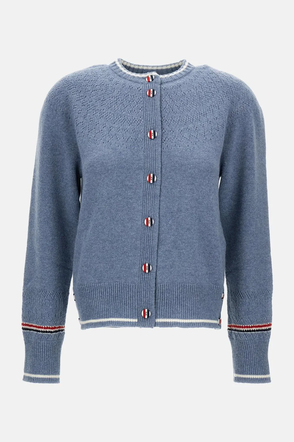Crewneck cardigan made from fine merino wool Front closure with fabric-covered buttons Cuffs with fabric-covered buttons Elegant and refined Fair Isle pointelle pattern Iconic knit detail with Thom Browne's distinctive RWB (red, white, blue) stripe Slim fit Perfect for formal and casual chic looks Color: light blue Details and Care Color: Azzurro Composition: 100% VIRGIN WOOL Made in: Italia Sku: FKC676AY1029440