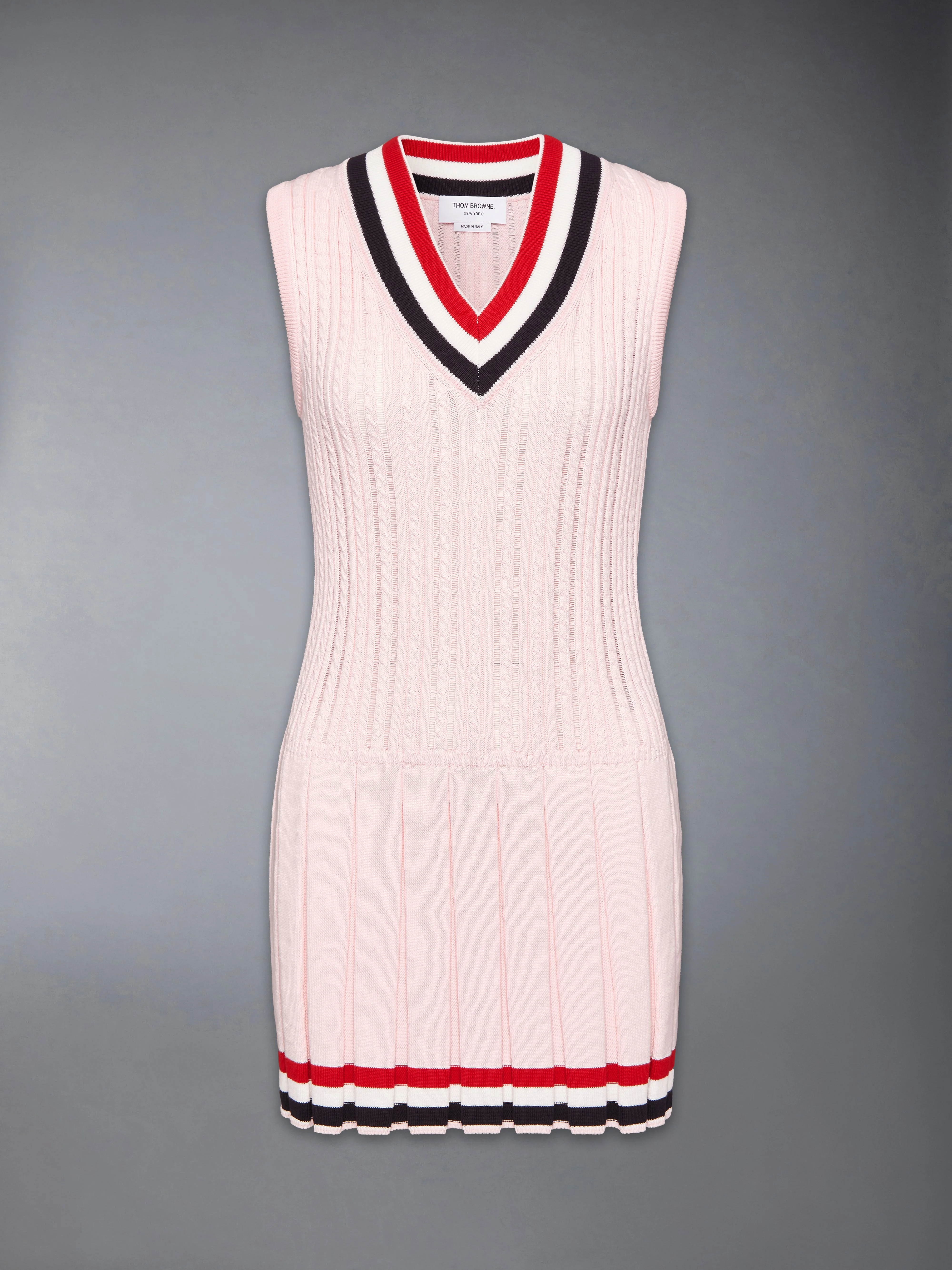 This mini dress in cotton cable reimagines classic cricket knits through a light, summer-minded lens. The ribbed RWB V-neckline anchors the look in Thom Browne’s signature codes, contrasted by a pleated skirt that introduces movement and ease. Worn with the matching cardigan, it channels the season's colorful and coordinated knitwear narrative. Ribbed RWB V-neckline Ribbed trim at armholes Pleated skirt RWB intarsia at hem Signature striped grosgrain loop tab Model is 5'10" (178 cm), wearing size 40 100% Cotton Made in Italy FKD183A-Y3014-642