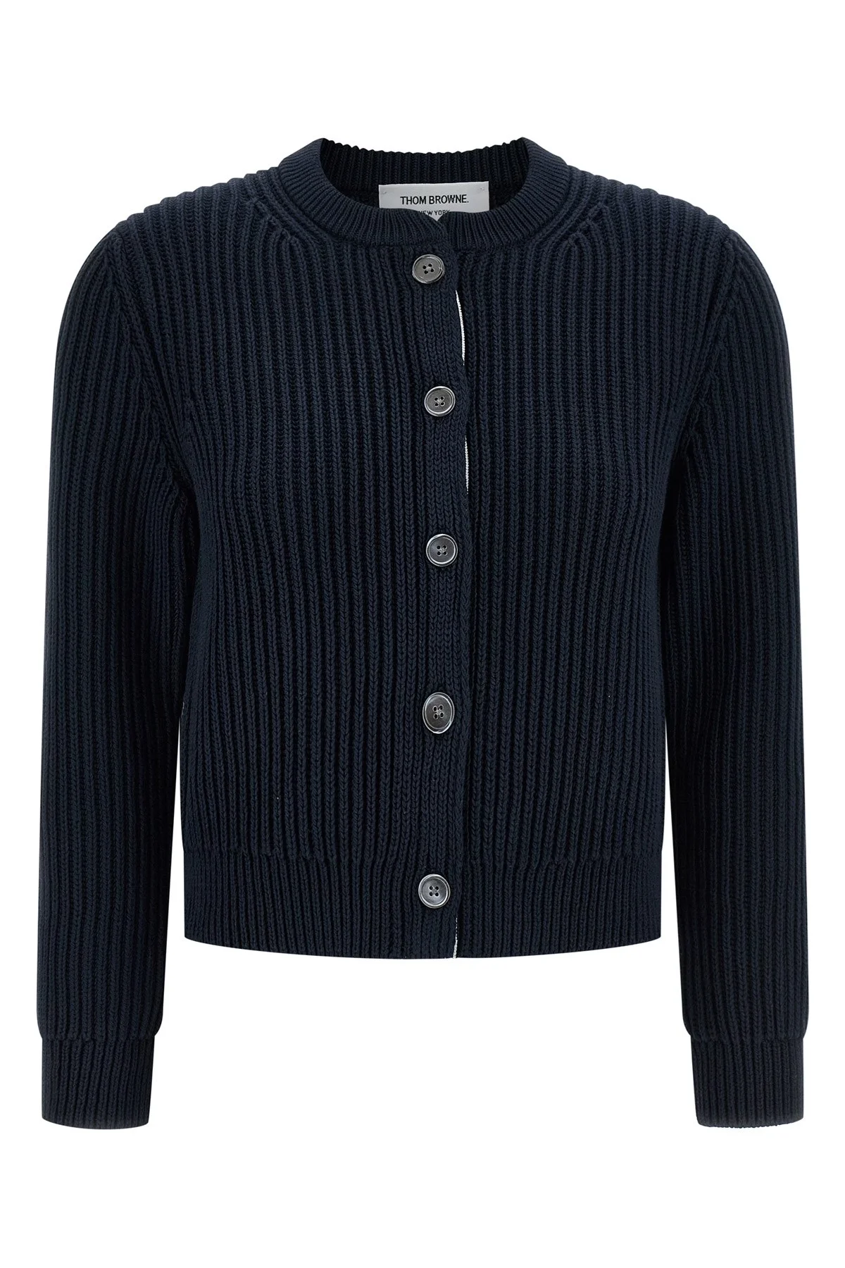 cod. FKC692AY3062415 Knitted cotton cardigan, crop model, crew neck, front button closure with RWB grosgrain tape lining, long cuffed sleeves. Color: Blue Size & Fit: true to size fit Composition: 100% cotton Made in: Italy