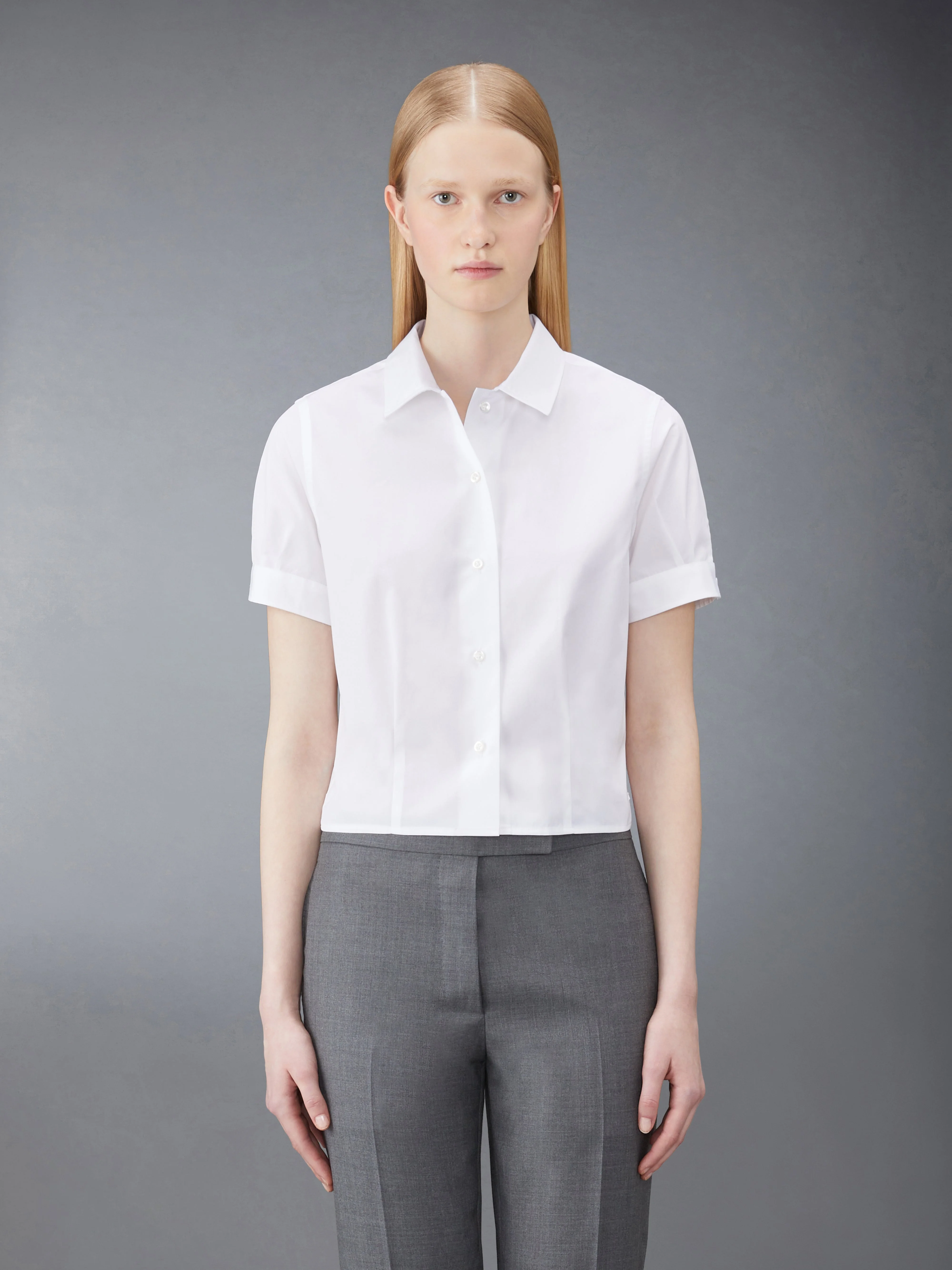 DETAILS & FIT A Thom Browne essential, our Poplin Short Sleeve Tucked Blouse exhibits quality craftsmanship and meticulous tailoring. Front button closure Signature striped grosgrain loop tab at back of neck Seamed back yoke with locker loop Model is 5' 10" (178cm), wearing size 40 100% Cotton Made in Italy FLL138A-03113-100