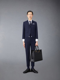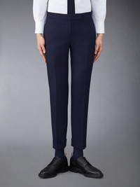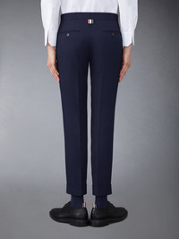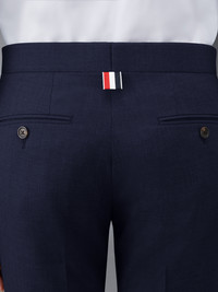 DETAILS & FIT Our Twill Low Rise Skinny Trouser. The classic shortened hem pays homage to Thom Browne’s distinguished tailoring. Tab front closure Adjustable Buttoned side tabs Creased legs Narrow cuffs Slip side pockets Button fastening back welt pockets Signature striped grosgrain loop tab at back waist Model is 5' 10" (178cm), wearing size 40 100% Wool Made in Italy FTC025V-00626-415