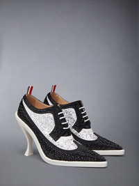 Crafted with the highest quality of classic shoemaking, our Swarovski Satin Heeled Longwing Brogue is a jazzy interpretation of our classic brogue, featuring a leather sole and 105mm curved heel. Curved heel Oxford shoe in black and leather Allover whole cut Swarovski crystal embellishments Lace up closure Tonal leather sole 105mm curved heel Striped insole and leather lining Signature striped grosgrain loop tabs at heels Combo1: 100% Crystal Upper: 100% Silk Sole: 100% Calf Leather Lining: 100% Goat Leather Lining2: 100% Lamb Leather Made in Italy FFH260A-E0553-980