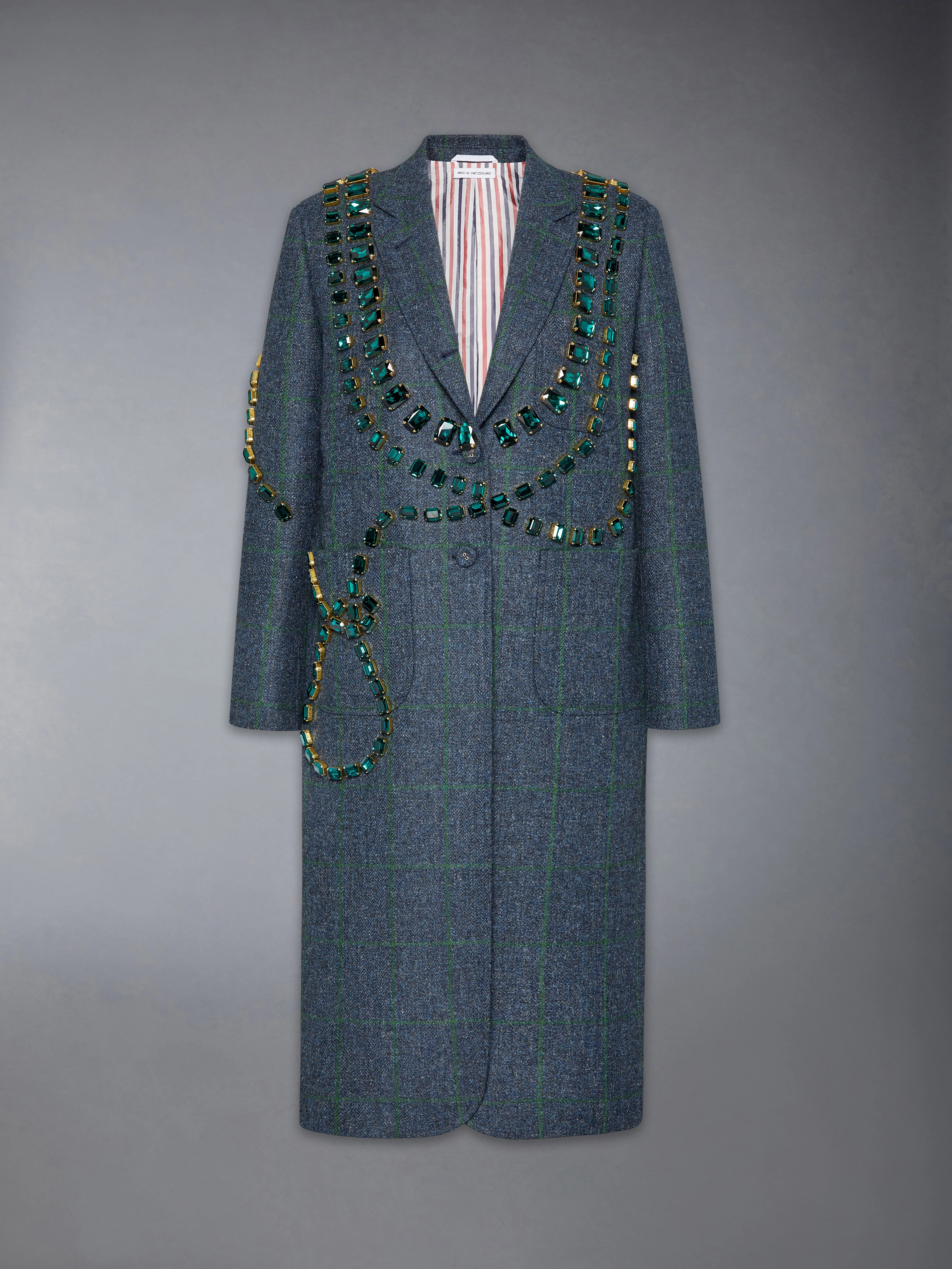 Crafted in traditional British sporting tweed, this luxurious coat blends country heritage with runway spectacle. Swarovski crystals are hand-set to create a trompe l’oeil necklace effect—each stone catching glimmers of light. Functional patch pockets add a layer of everyday practicality to this head-turning garment. Front button closure 3 Front patch pockets Buttoned cuffs with signature striped grosgrain trim Interior pockets with name tag Single back vent Signature striped grosgrain loop tab Model is 5'10" (178 cm), wearing size 40 100% Wool Lining: 100% Cupro Made in Italy FBR060E-F1010-440