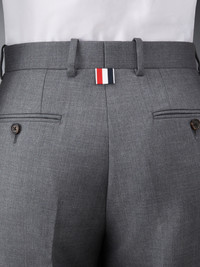 DETAILS & FIT Our Twill Sack Trouser. The classic shortened hem pays homage to Thom Browne’s distinguished tailoring. Tab front closure Belt loops Slip side pockets Fastening back welt pockets Signature striped grosgrain loop tab at back waist FIt 2 Model is 5' 10" (178cm), wearing size 40 100% Wool Lining: 100% Cupro Made in Italy FTC400A-00626-035