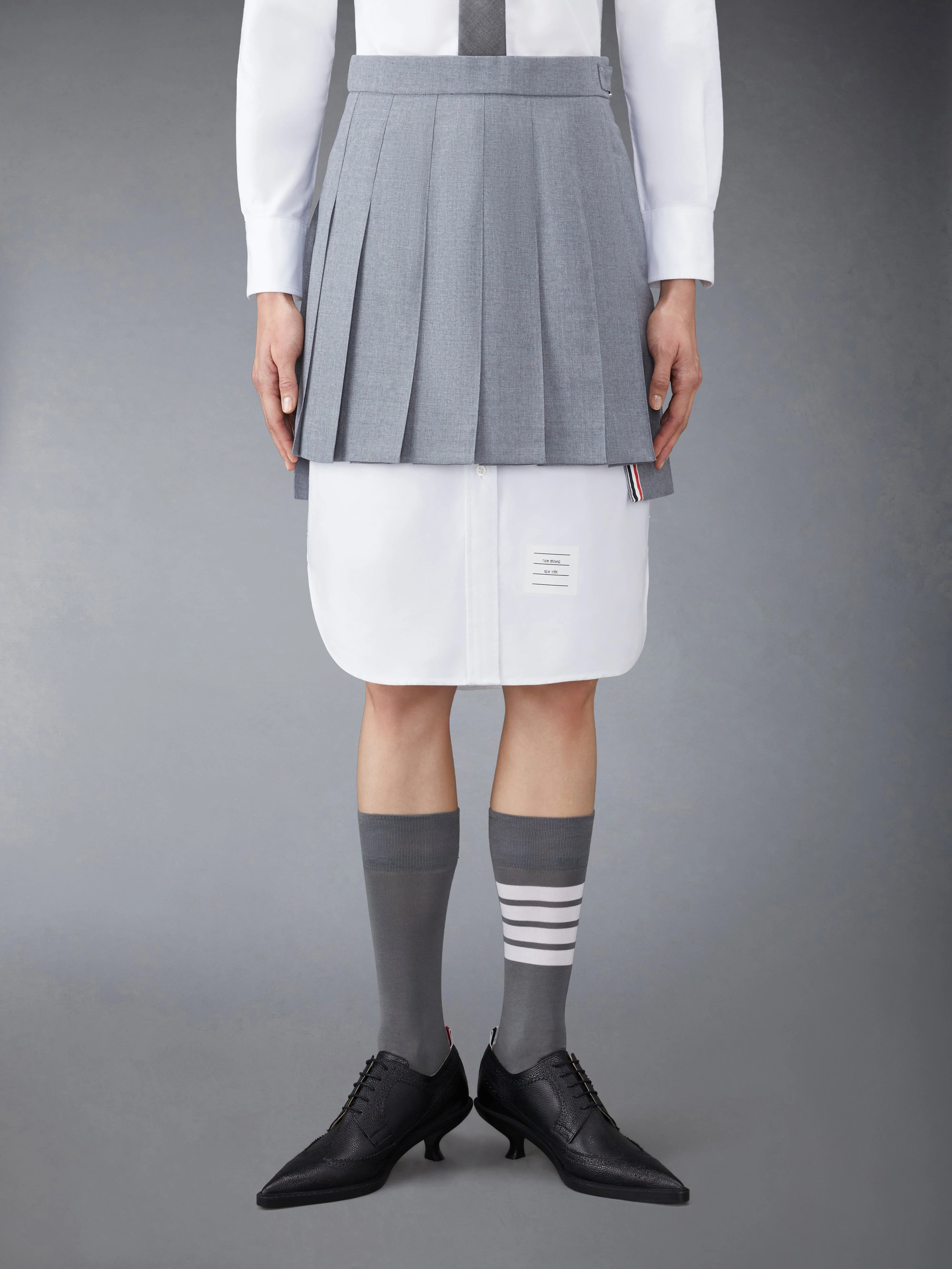 DETAILS & FIT Inspired by East Coast preppy icons but reimagined with inventive proportions and quality craftsmanship, our Plain Weave School Uniform Thigh Length Dropped Back Pleated Skirt is a fresh take on a traditional silhouette. Side zip closure Adjustable button backstrap Dropped back hem with signature grosgrain trim Signature striped grosgrain loop tab at back waist Model is 5' 10" (178cm), wearing size 40 50% Wool, 50% Polyester Lining: 100% Cupro Made in Italy FGC402V-02872-035