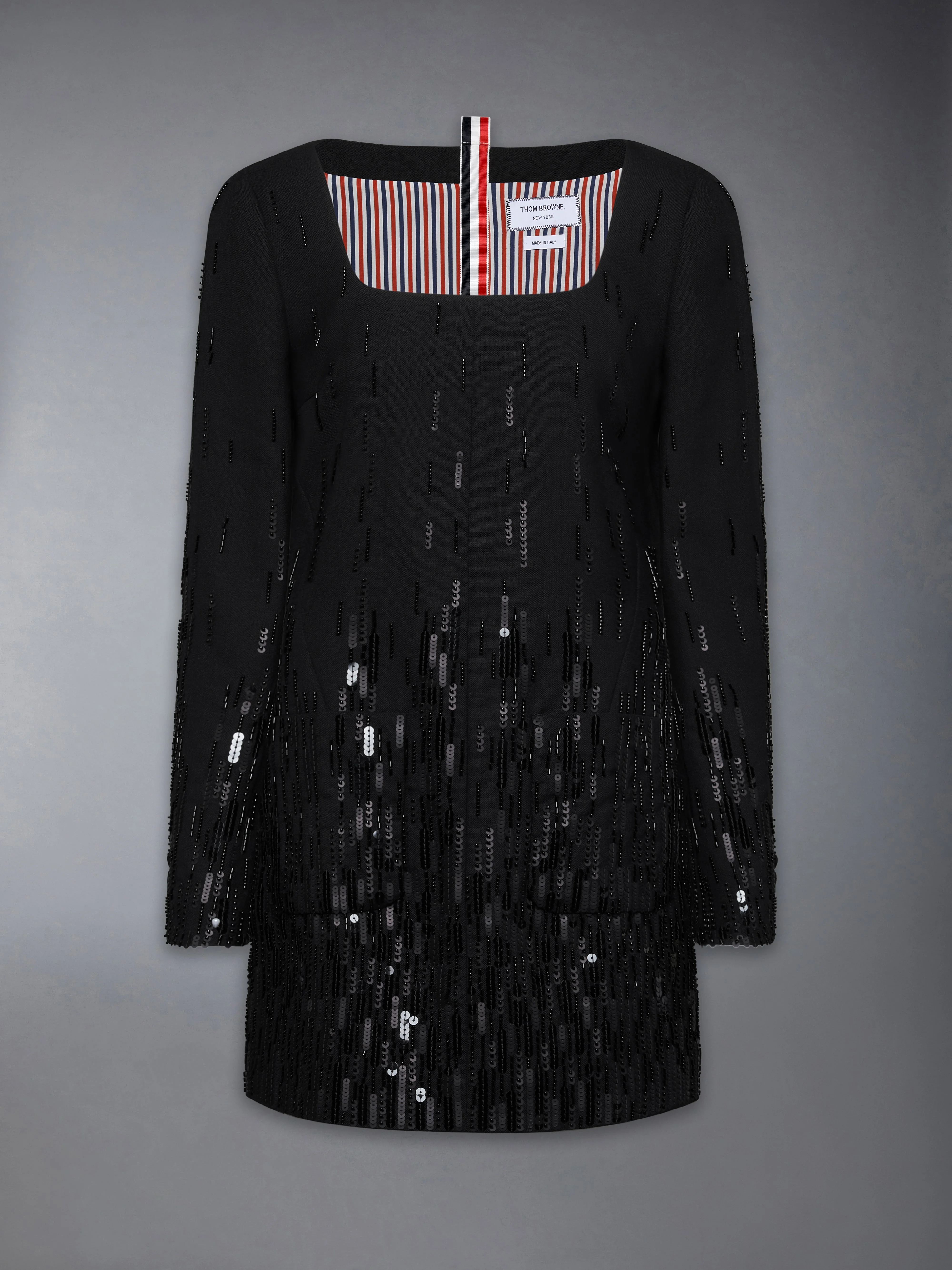 An exploration of black tie through contrast and craft. This long-sleeve sack dress reimagines evening codes with allover degrade embroidery, layering matte and shiny sequins, cut beads, and bugle beads in a soft fade. Structured through shaping darts and lined in striped silk, it reflects Thom Browne’s approach to tailoring as composition. Wear over a crisp oxford cotton shirt and the matching Degrade Embroidered Short Tie for a uniform take on evening dressing. Back hidden zip closure with RWB-detailed pull Scoop neckline Patch hand pockets Front shaping darts Cuffs with anchor-engraved buttons and RWB grosgrain trim Tricolor silk lining Signature striped grosgrain loop tab Fit 2 - Sack fit Model is 5'10" (178 cm), wearing size 40 100% Wool Combo 1: 100% Silk Made in Italy FDSF36E-E1476-001