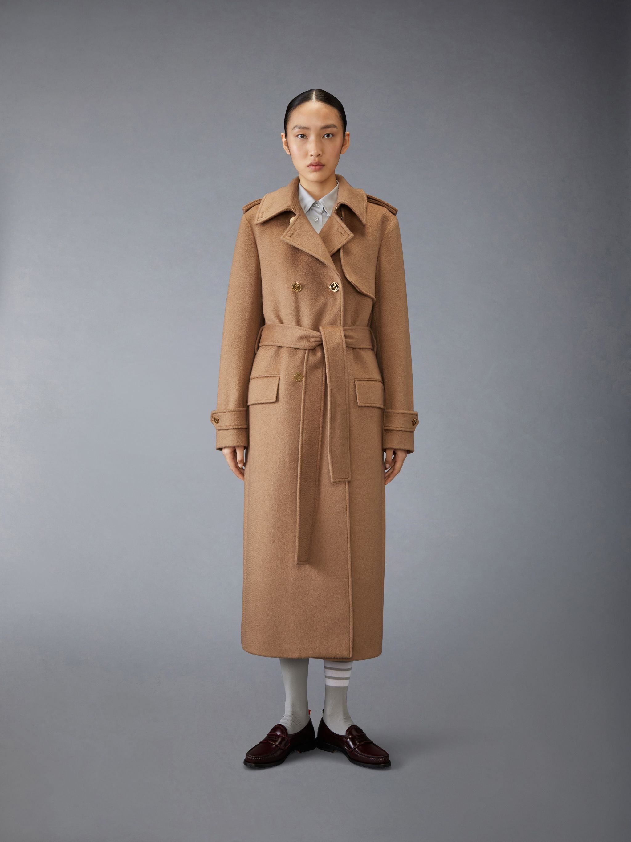 DETAILS & FIT Luxuriously soft. Meticulously tailored. Our seasonal Camel Hair Elongated Trench Coat is the epitome of sophistication. Keep cozy in style this season. Double breasted front button closure 2 Front flap pockets Waist tie Tricolor stripe lining with interior pockets and name tag Signature striped grosgrain loop tab Model is 5'10" (178 cm), wearing size 40 100% Baby Camelhair Lining: 100% Cupro Made in Italy FOC874A-F0785-275