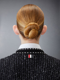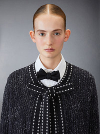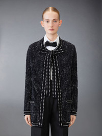 DETAILS & FIT This charming cardigan combines the timeless elegance of classic layering pieces with a playful, spirited bow and signature Thom Browne emblems throughout. 2 Front slip pockets Signature striped grosgrain loop tab Model is 5'10" (178 cm), wearing size 40 79% Cotton, 16% Polyamide, 4% Viscose, 1% Polyester Made in Italy FKC633B-Y9035-001