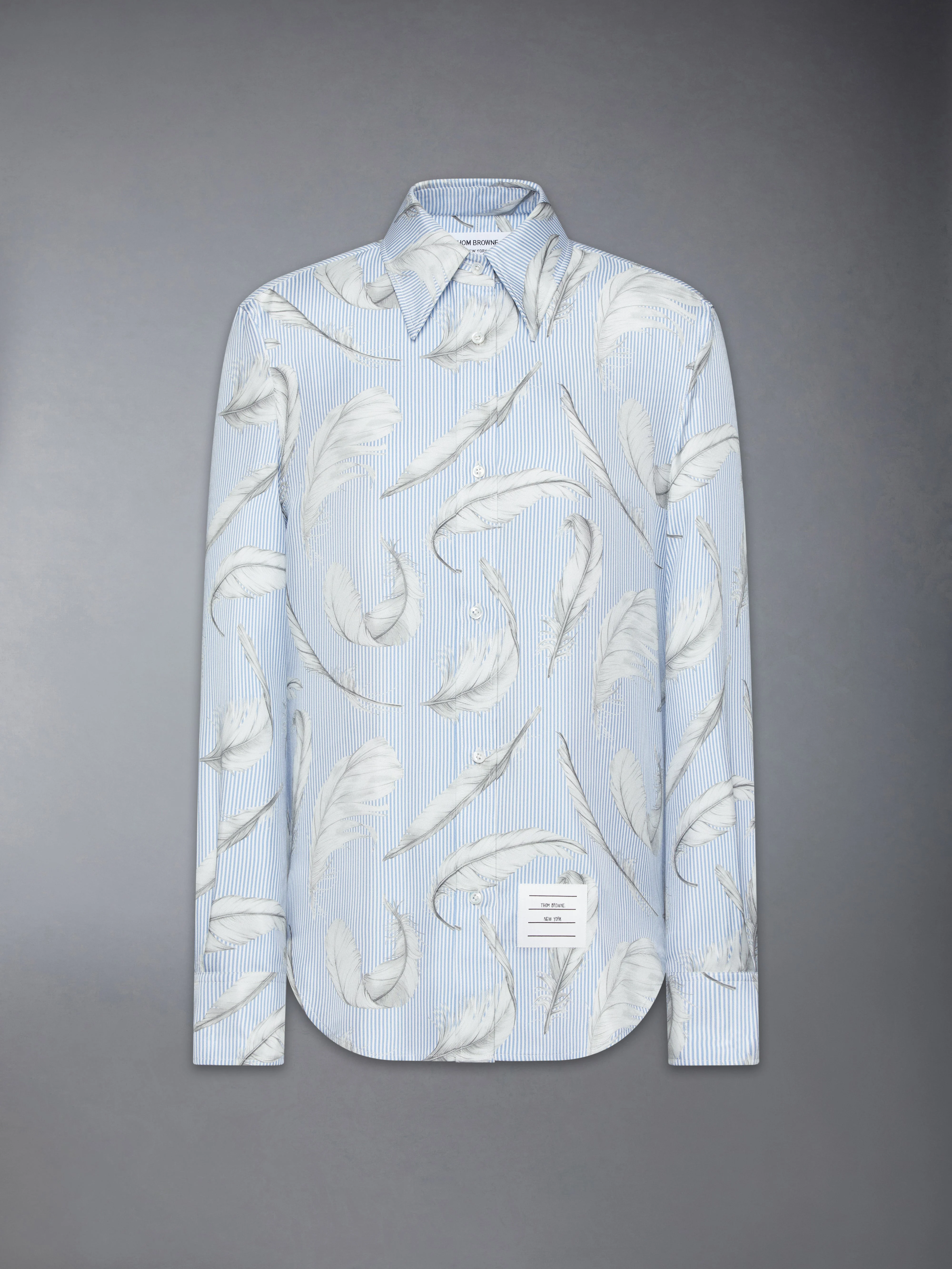 A dress shirt that invites a closer look. Delicate feathers symbolize bird migration patterns, seasonal shifts, and new beginnings, while paying homage to nature's timeless rhythms. Made from luxurious silk twill, this statement piece is as meaningful as it is elegant. Complete the look with our Feather Printed Silk Twill Skirt and Feather Printed Silk Twill High Armhole Sport Coat. Front button closure Name tag applique Pleated back yoke with locker loop Signature striped grosgrain loop tab Model is 5'10" (178 cm), wearing size 40 100% Silk Made in Italy FLL162A-F0941-480 FLL162A-F0941-480