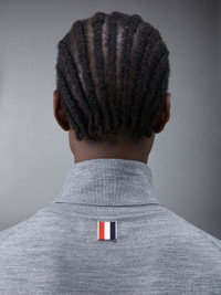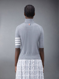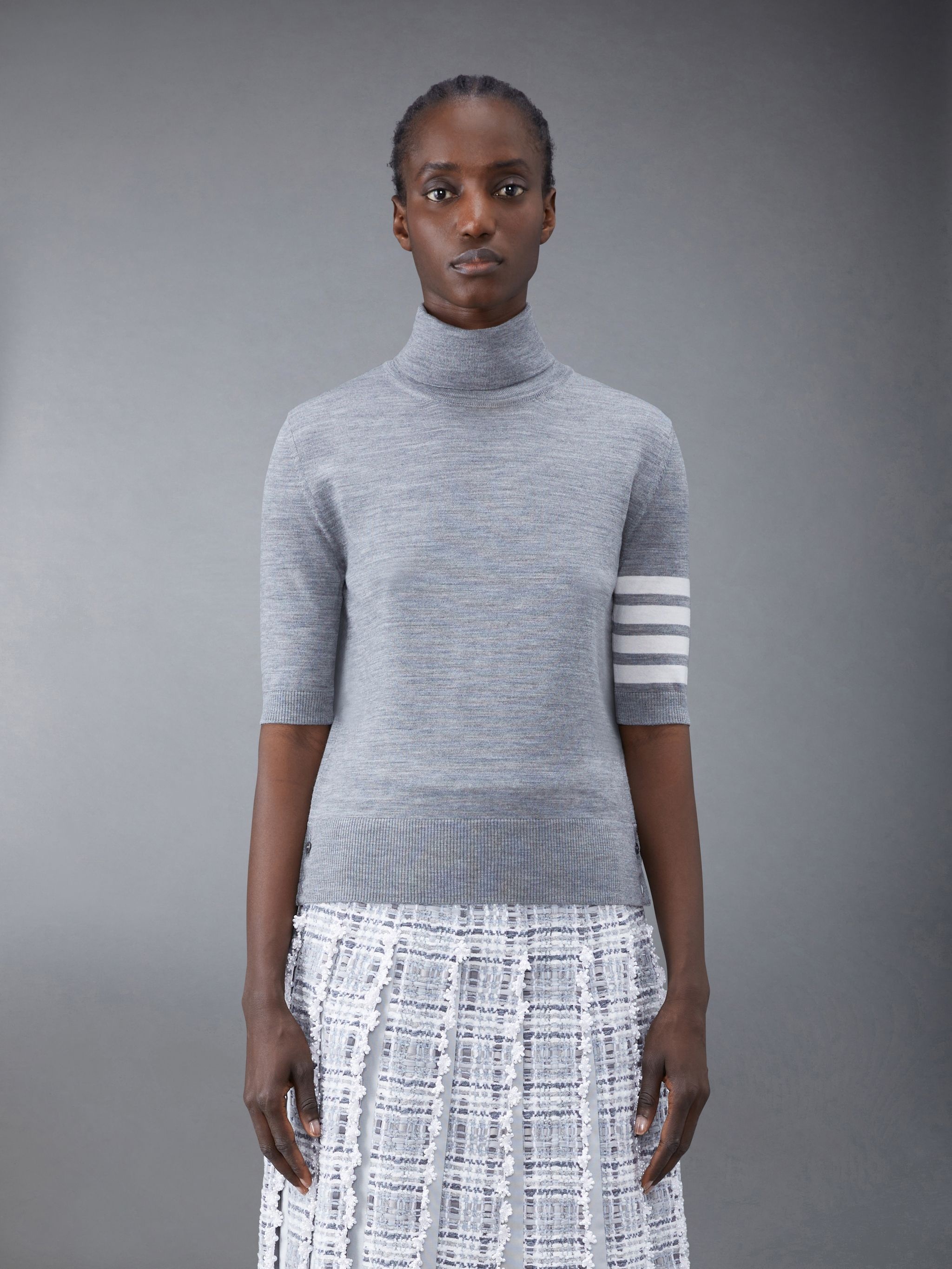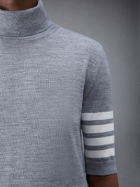 DETAILS & FIT Relaxed short sleeve turtleneck in fine grey Merino wool with 4-bar stripe detail at left sleeve in white. Buttoned side vents with signature striped grosgrain trim. Signature striped grosgrain loop tab at back of neck. Model is 5'10" (178 cm), wearing size 40 99% Virgin Wool, 1% Polyamide Made in Italy FKA434AY1014055