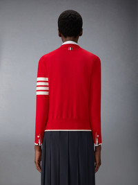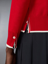 This lightweight cardigan balances softness with structure, knit in fine merino wool with a clean, refined hand. Cut in a relaxed fit, it features 4-bar detailing at the sleeve and contrast tipping at the neckline and hem—elements that ground the silhouette in the Thom Browne uniform system. Designed for effortless layering year-round. V-neckline Front button closure with RWB grosgrain placket Slip hand pockets with ribbed trim Ribbed cuffs and side vents with buttons and RWB grosgrain trim Contrast tipping at cuffs and hem 4-bar detailing Signature striped grosgrain loop tab Relaxed fit Model is 5'10" (178 cm), wearing size 40 100% Virgin Wool Made in Italy FKC334D-Y1014-600