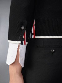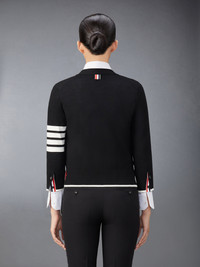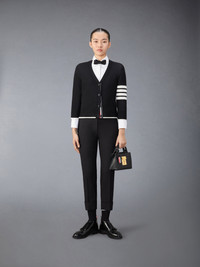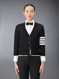 DETAILS & FIT A signature Thom Browne emblem defines this classic cardigan — iconic 4-Bar stripes, synonymous with the brand. Presented in breathable soft wool fabric, this cardigan is a longstanding staple made with a relaxed fit for added comfort. V-neckline 4-bar detailing Front button closure with striped grosgrain placket Buttoned cuffs and side vents with signature striped grosgrain trim Signature striped grosgrain loop tab Model is 5'10" (178 cm), wearing size 40 100% Virgin Wool Made in Italy FKC334D-Y1014-001