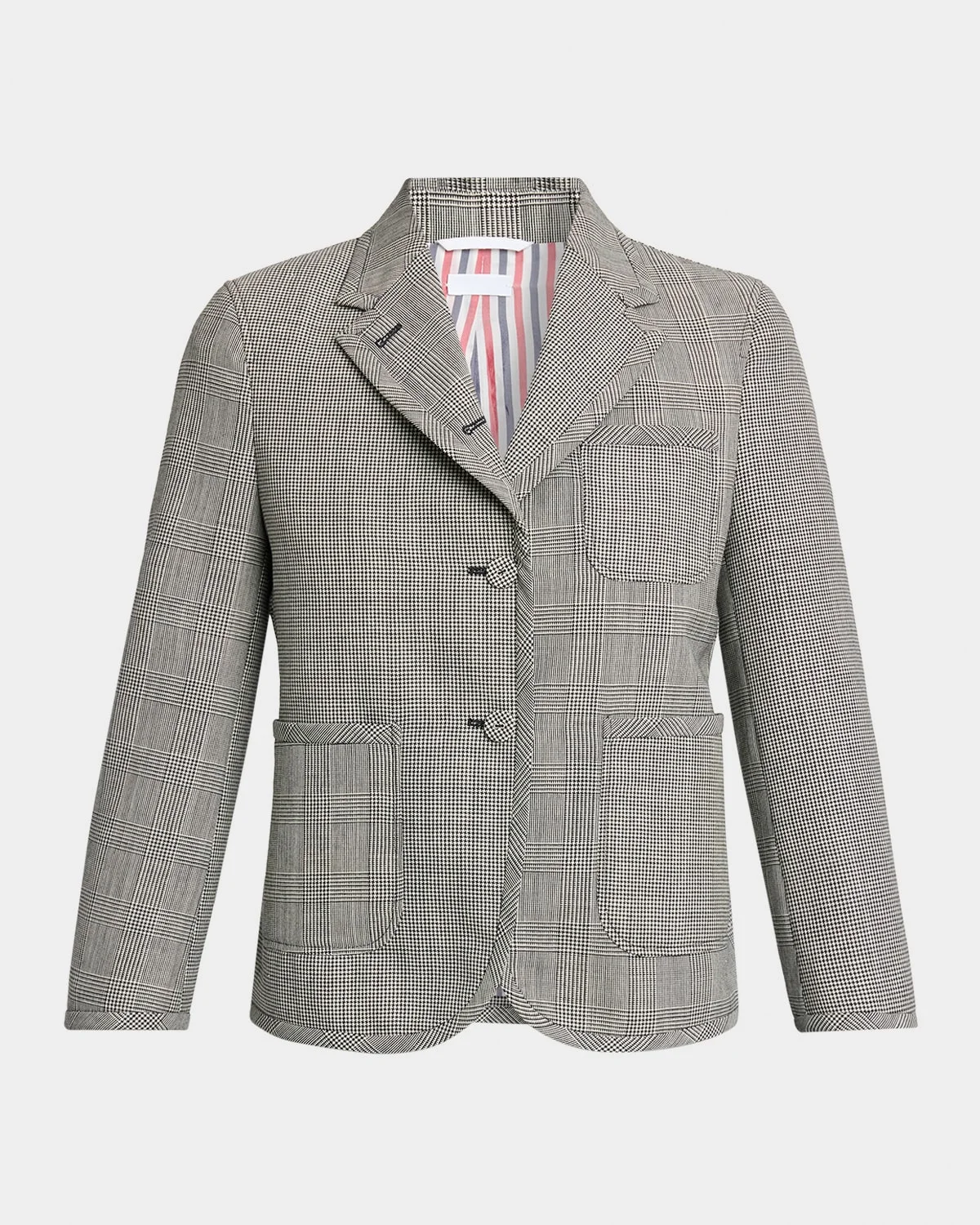 Thom Browne sport coat is crafted from multicheck wool accented with a signature grosgrain loop on the back Notch lapels; singlebreasted front Long sleeves; button cuffs Chest and hip aptch pockets Slim fit; fit 2 Cropped at the hip Walking vent back Wool Lining: Cupro Dry clean Made in Italy