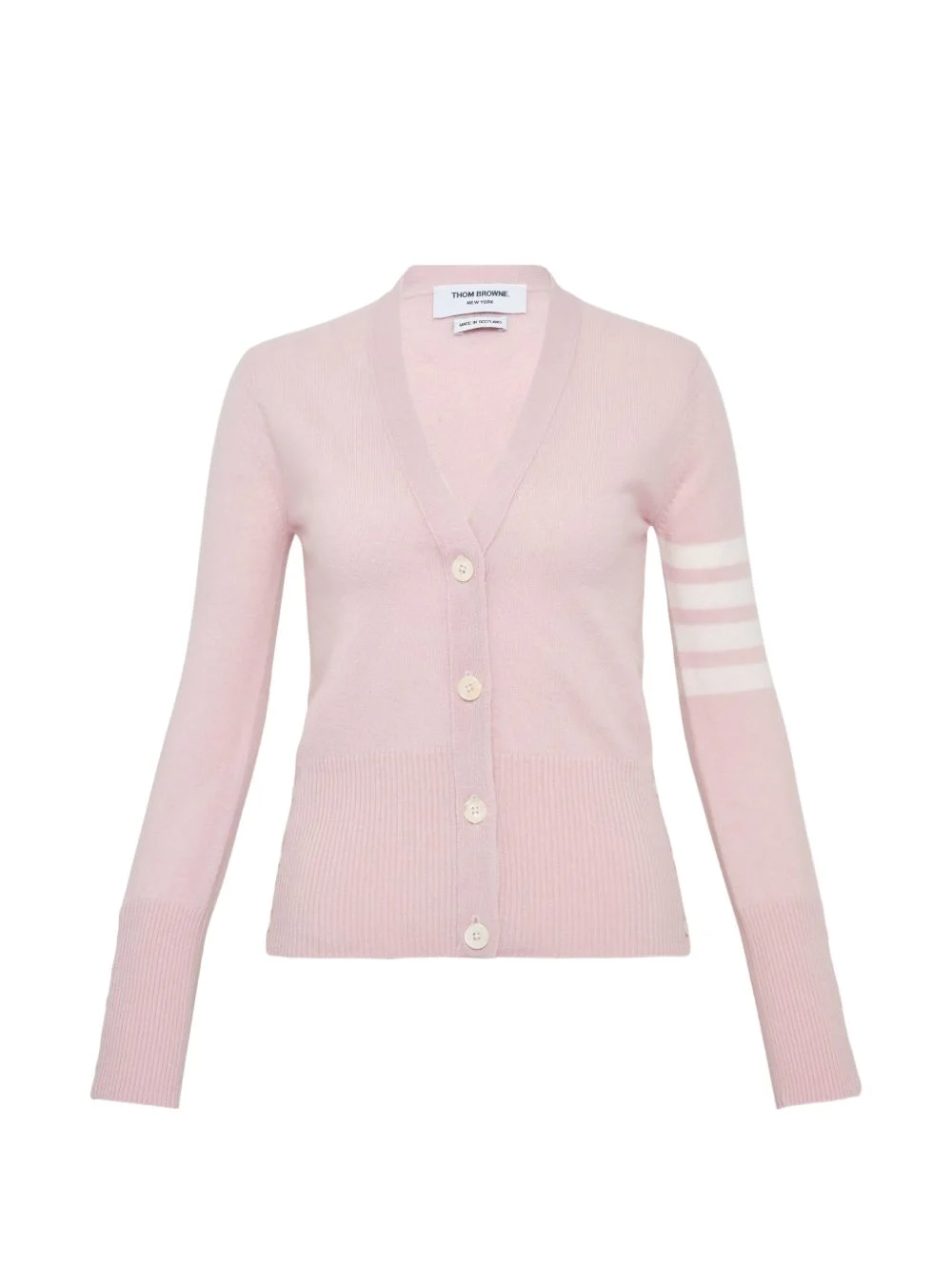 four-bar V-neck cardigan Highlights - Pink - V-neck - Four-bar stripe at sleeve - Button fastening - Ribbed hem Made in United Kingdom Composition Cashmere 100% Washing instructions Read Manufacturer Guidelines