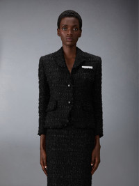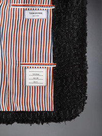 This high break sport coat reimagines tailoring through the lens of festive formality. Crafted in satin ribbon tweed, one of the season’s most intricate materials, its surface is woven from ten different yarns including satin ribbon and grosgrain for a richly dimensional and luminous finish. Frayed edges push the polish just enough, striking a balance between craft and modernity in true Thom Browne fashion. Front anchor-engraved button closure Three interior pockets Buttoned cuffs with RWB grosgrain trim Double back vent Tricolor silk lining Signature striped grosgrain loop tab Model is 5'10" (178 cm), wearing size 40 55% Polyester, 37% Cotton, 7% Polyamide, 1% Acrylic Lining: 100% Silk Made in Italy FBC955T-F1091-001