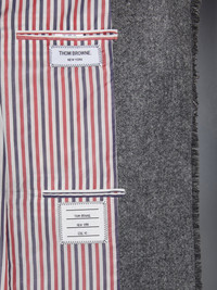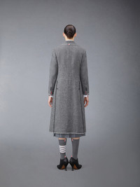 Our Donegal Tweed Wide Lapel Overcoatexudes Thom Browne's mastery of minimalistic design and tailored excellence. A single button-front closure is at center, while an iconic striped grosgrain loop tab rests at the nape of the neck. Front button closure 2 front flap pockets Notched lapels Buttoned cuffs with signature striped grosgrain trim Double vented back with grosgrain trim Model is 5' 10" (178cm), wearing size 40 100%Wool Made in Italy FOC320W-05385-035
