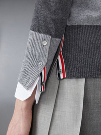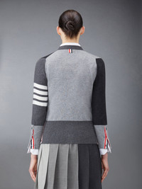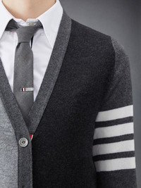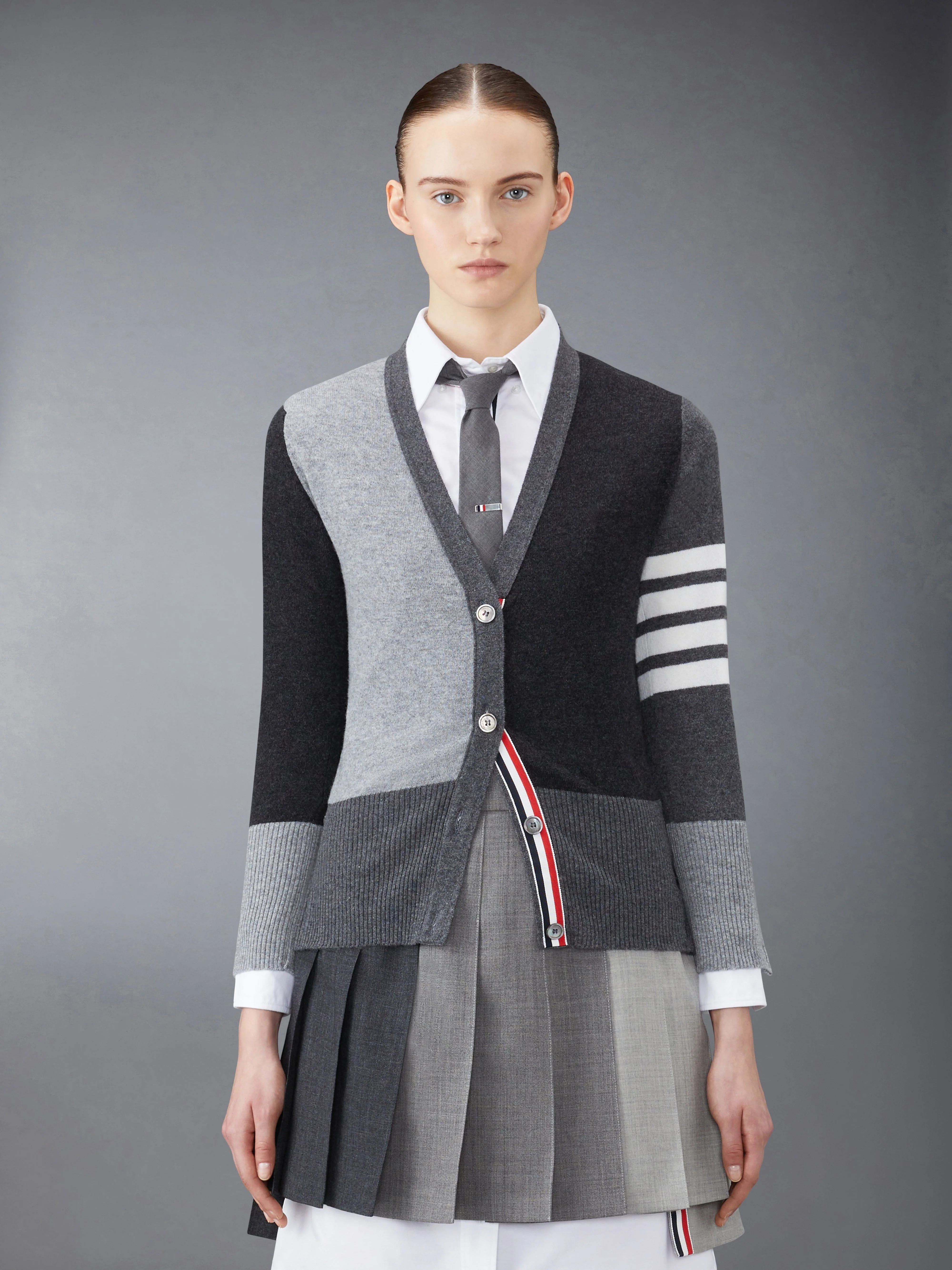 DETAILS & FIT Our Fun-Mix Cashmere 4-Bar V-neck Cardigan. Shades of rich cashmere are woven together in patchwork form amidst two signature Thom Browne emblems — 4-Bar stripes and grosgrain ribbon. V-neckline Front button closure with striped grosgrain placket 4-bar stripe detail at left sleeve Buttoned side vents and cuffs with signature striped grosgrain trim Signature striped grosgrain loop tab at back of neck Model is 5' 10" (178cm), wearing size 40 100% Cashmere Made in the UK FKC001F-00011-982 - SLEEVE LENGTH: 42.5cm - Shoulder Width: 33.5cm - Length: 54.0cm - WAIST: 66.0cm - BUST: 79.0cm