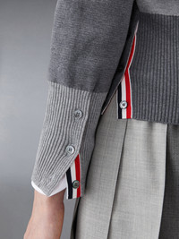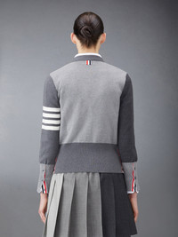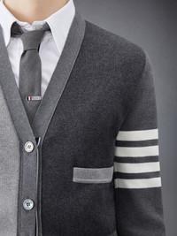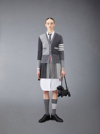 DETAILS & FIT Our Fun-Mix Crepe 4-Bar Cardigan. Shades of fine cotton are woven together in patchwork form amidst two signature Thom Browne emblems — 4-Bar stripes and grosgrain ribbon. V-neckline Front button closure with striped grosgrain placket 4-bar stripe detail at left sleeve Buttoned side vents and cuffs with signature striped grosgrain trim Signature striped grosgrain loop tab at back of neck Model is 5' 10" (178cm), wearing size 40 100% Cotton Made in Italy FKC207F-00219-982