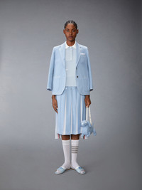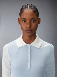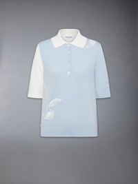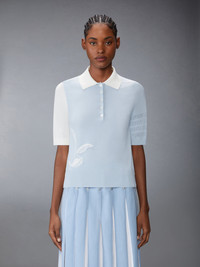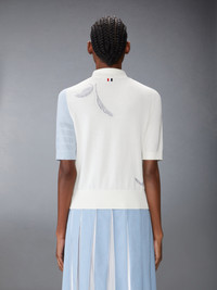 Delicate woven feathers cascade down this polo, symbolizing bird migrations and the changing seasons. Our signature 4-bar detailing pays homage to midcentury collegiate and sports uniforms, embodying discipline, achievement, and tenacity—values at the heart of Thom Browne. Partial front button placket Buttoned side vents with signature striped grosgrain trim Signature striped grosgrain loop tab Model is 5'10" (178 cm), wearing size 40 100% Cotton Made in Italy FKP123F-Y3036-482 FKP123F-Y3036-482