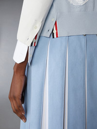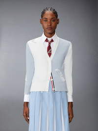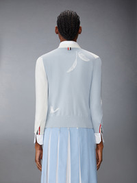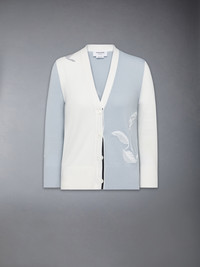 Delicate woven feathers cascade down this cardigan, symbolizing bird migrations and the changing seasons. Subtle 4-bar detailing pays homage to midcentury collegiate and sports uniforms, embodying discipline, achievement, and tenacity—values at the heart of Thom Browne. Layer it over a dress shirt or tee on cool days and nights. Front button closure with striped grosgrain placket Buttoned side vents with signature striped grosgrain trim Buttoned cuffs with signature striped grosgrain trim Signature striped grosgrain loop tab Model is 5'10" (178 cm), wearing size 40 100% Cotton Made in Italy FKC651F-Y3036-482 FKC651F-Y3036-482