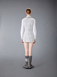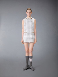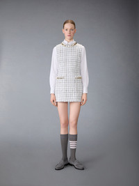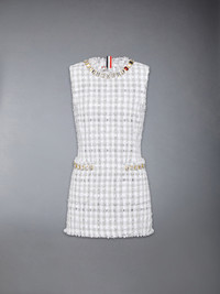 As seen on the Thom Browne runway, this sculptural mini dress is woven from seven distinct yarns to create a rich, dimensional tweed. Meticulously crafted, it features hand-placed Swarovski crystal embellishments that glimmer across the collar and pockets. Layer it over one of our beloved Oxford shirts. Back zip closure 2 Front patch pockets Signature striped grosgrain loop tab Model is 5'10" (178 cm), wearing size 40 41% Polyester, 37% Cotton, 18% Polyamide, 2% Other Fibres, 2% Rayon Lining: 100% Silk Made in Italy FDR083E-F1006-035