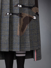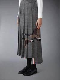 A meticulously tailored skirt depicts geese taking flight on their annual journey. As they fly in graceful formations, they set their sights on new beginnings and the promise of something greater. Their transition marks the passage of time, a constant reminder that every fresh start is a journey toward growth. More than a skirt, this garment holds a message, a story of change, hope, and unity. Side zip closure Dropped back hem with signature striped grosgrain trim Signature striped grosgrain loop tab Model is 5'10" (178 cm), wearing size 40 100% Wool Combo 1: 58% Wool, 42% Silk Combo 2: 100% Wool Combo 3: 100% Wool Combo 4:100% Polyester Combo 5: 51% Silk, 49% Wool Lining: 100% Cupro Made in Italy FGCA24E-E1376-035