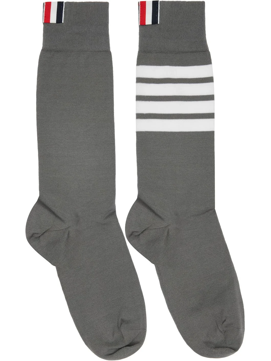 Pair of calf-high lightweight knit cotton-blend socks. · Tricolor grosgrain flag at rib-knit cuffs · Intarsia stripes at single ankle · Logo stamp at sole Supplier color: Med grey 75% cotton, 25% polyamide. Made in United Kingdom 261381F076006