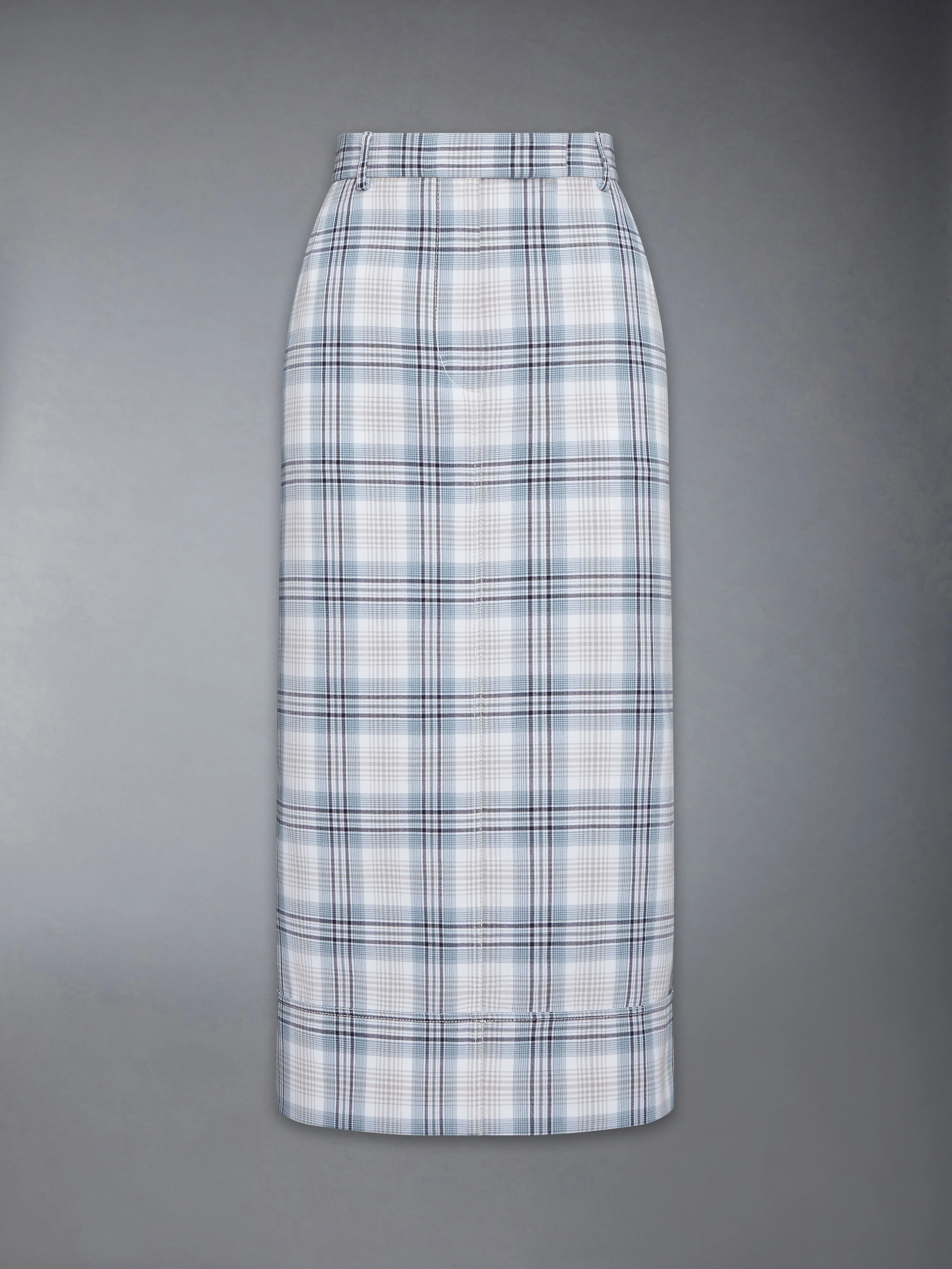 Cut in super-twist cotton with a crisp, crepe-like hand, this sack skirt reflects the brand's structured vocabulary through a softened frame. The custom windowpane plaid check reinforces a sense of precision, while soft volume and a lightly tailored finish bring ease to the silhouette. Pair with the matching Windowpane Plaid Cotton Sack Jacket for Thom Browne's signature take on coordinated tailoring. Calf length Tab closure with hook and internal button Zip fly Slip hand pockets Buttoned back welt pockets Single back vent Faced hem Signature striped lining Signature striped grosgrain loop tab Model is 5'10" (178 cm), wearing size 40 97% Cotton, 3% Polyamide Lining: 100% Cupro Made in Italy FGC976H-F1086-996