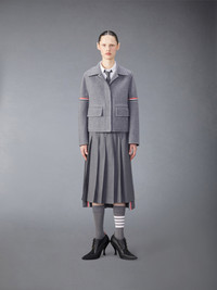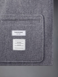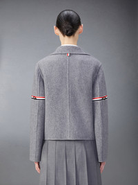 Signature Thom Browne emblems add an innovative twist to this classic silhouette. Layer this luxe jacket over any of our dress shirts or tees on cool fall days. Crafted in fine wool cashmere. Hidden front closure 2 flap pockets Interior name tag Signature striped grosgrain armbands with buttons Signature striped grosgrain loop tab Model is 5'10" (178 cm), wearing size 40 90% Wool, 10% Cashmere Made in Italy FBC915S-F0656-035