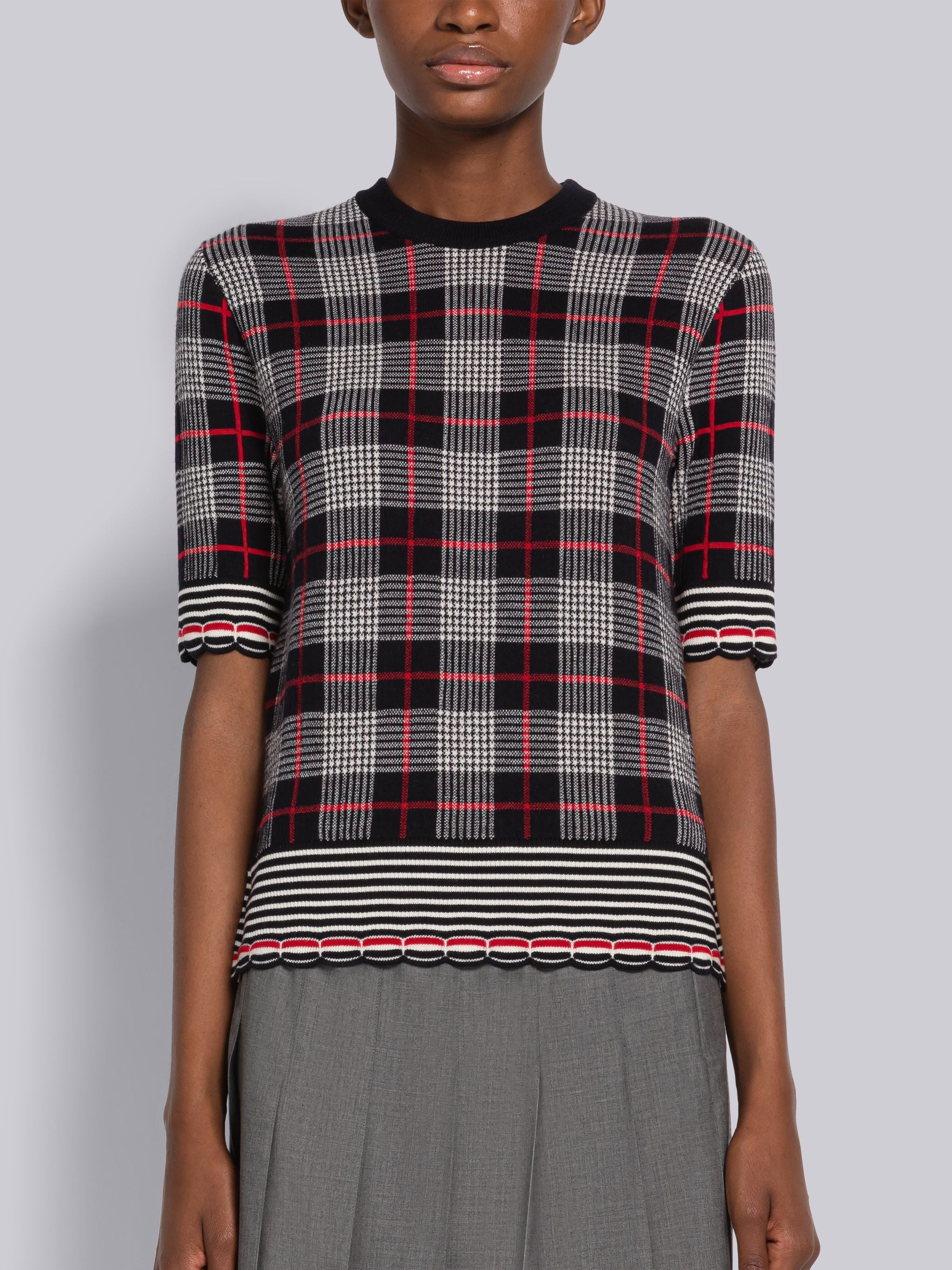 DETAILS & FIT Short sleeve tee in hairline check jacquard Merino with striped scalloped edges. Bound crew neckline. Signature striped grosgrain loop tab at back of neck. Model is 5'10" (178 cm), wearing size 40 Made in Italy 100% Wool FKA411AY1014415