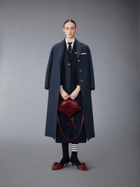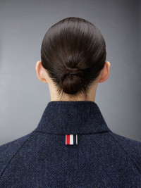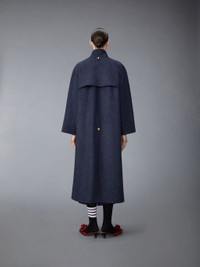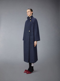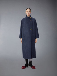 DETAILS & FIT To craft this one-of-a-kind coat, Thom drew inspiration from the late French caricaturist Georges Goursat, also known as "Sem," who often depicted the social elite. With its fine tweed fabric and elegant length, this luxurious overcoat looks as if it's been pulled from the pages of one of Sem's drawings. Embrace grandeur this season. Front button closure 2 Front patch pockets Single buttoned back vent Tricolor stripe lining with interior pockets and name tag Signature striped grosgrain loop tab Model is 5'10" (178 cm), wearing size 40 100% Wool Lining: 100% Cupro Made in ITALY FOC857A-02508-415
