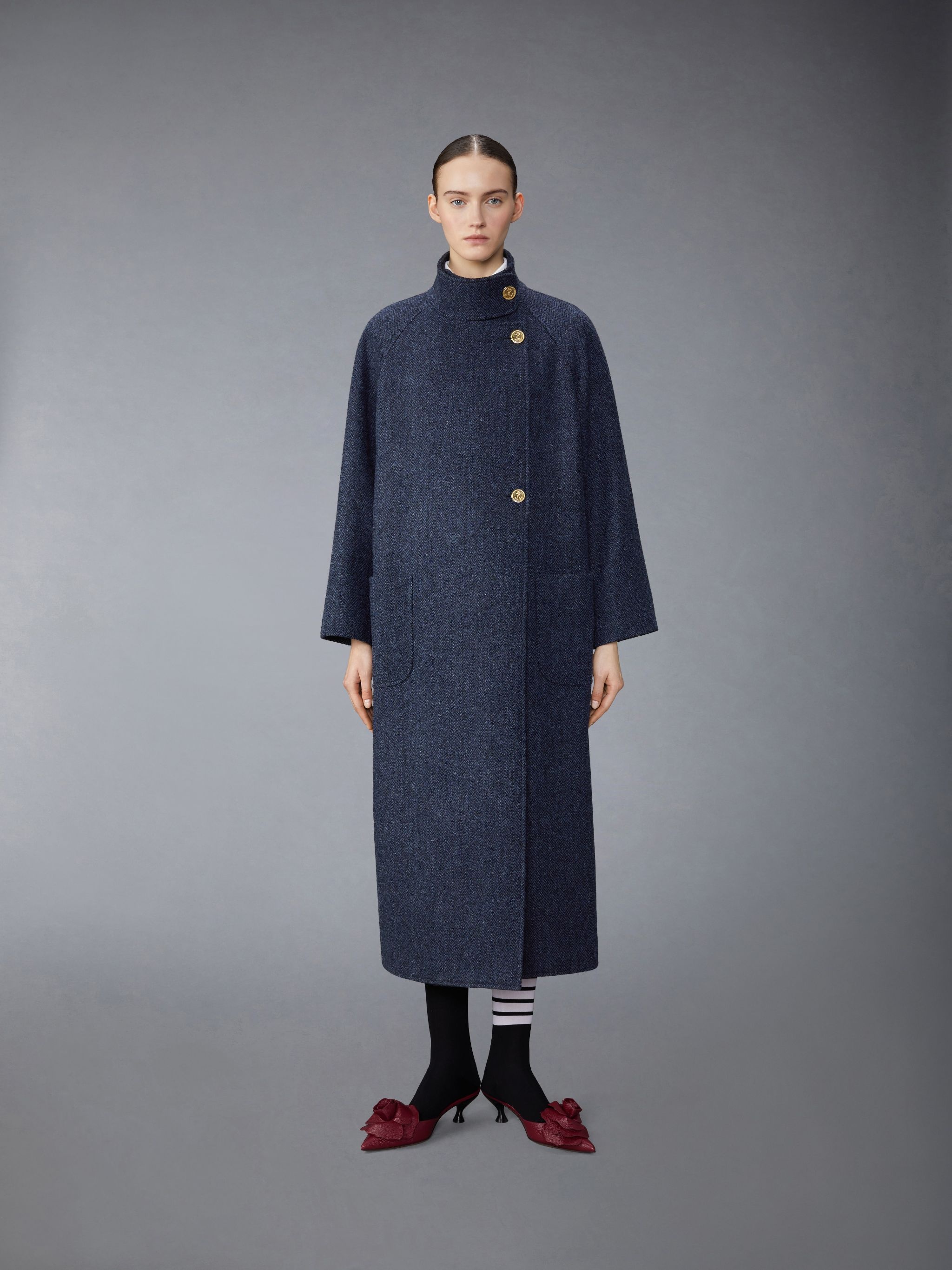 Herringbone Harris Tweed Midi Raglan Funnel Neck Coat