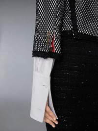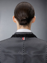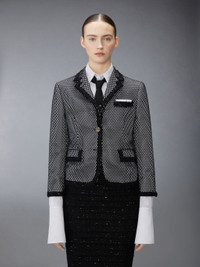 DETAILS & FIT This sport coat pays homage to Edgar Allan Poe's "The Raven," in which a distraught lover encounters a mysterious raven at his windowsill. The fabric's interplay of light and dark captures the tension between beauty and darkness, echoing the haunting themes in Poe's poem. Front button closure 2 Flap pockets Single chest pocket Double back vent Buttoned cuffs with signature striped grosgrain trim Interior pockets with name tag Signature striped grosgrain loop tab Model is 5'10" (178 cm), wearing size 40 100% Polyamide Combo2: 100% Silk Lining: 100% Cupro Made in Italy FBR037B-03193-001