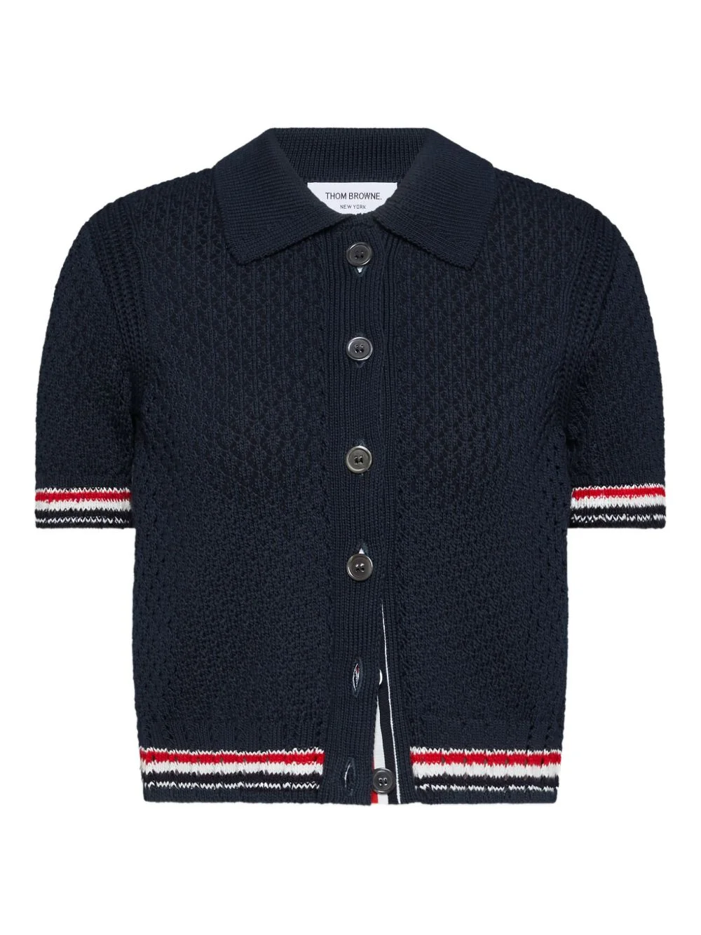 Hector Pointelle short sleeve cardigan Highlights - Navy blue - Cotton - Pointelle knit - Button fastening - Short sleeves - Striped trim - Polo collar Made in United Kingdom Composition Cotton 100% Washing instructions Read Manufacturer Guidelines