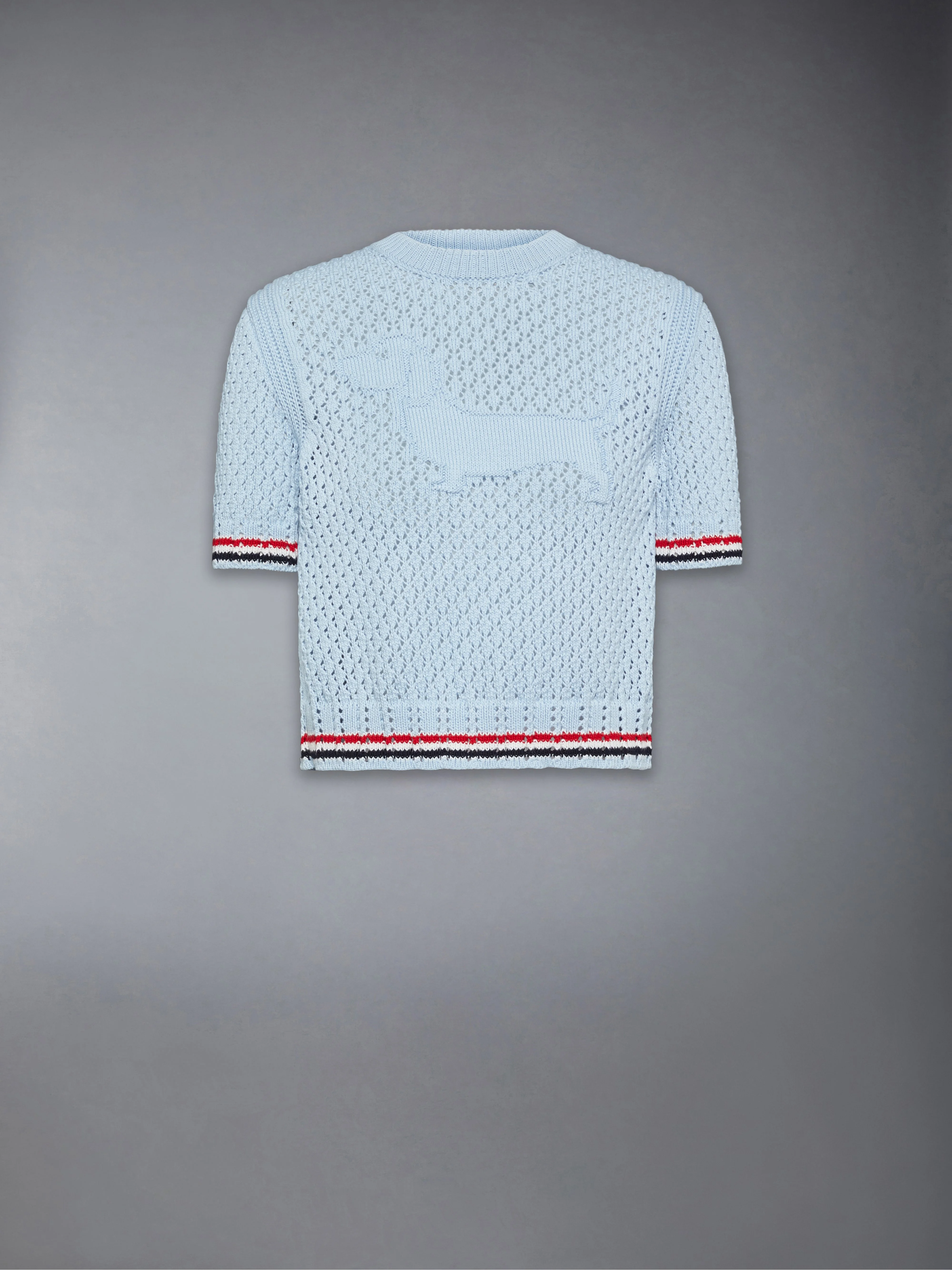 Hector marks ten years as a Thom Browne icon, rendered in tonal intarsia across the front of this airy pointelle tee. Crafted in breathable cotton, the open stitch highlights refined knitwork with a balance of delicacy and structure. Worn alone or layered over shirting, it lends lightness and definition to seasonal dressing. Ribbed neckline Contrast stitch trim along armholes Ribbed cuffs and hem with RWB tipping Hector intarsia Signature striped grosgrain loop tab Model is 5'10" (178 cm), wearing size 50 100% Cotton Made in the United Kingdom FKA511A-Y3062-472