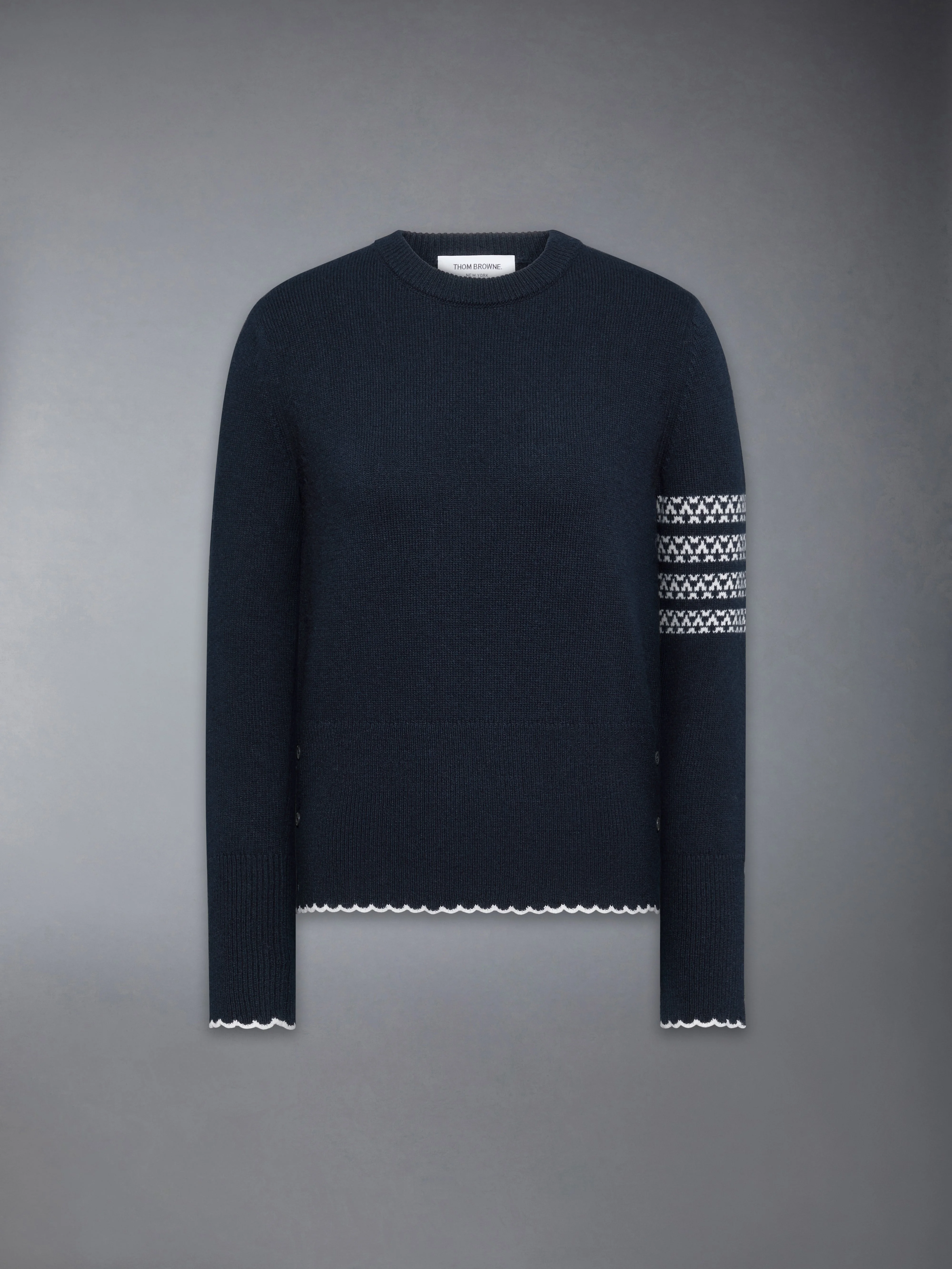 Whimsy meets tradition in this seasonal crewneck, knit in soft merino wool. A Fair Isle–inspired take on the signature 4-bar motif is paired with a matching intarsia of Hector, marking ten years as Thom Browne icon. These playful patterns bring festive charm to a timeless silhouette, finished with delicate scalloped cuffs. Ribbed neckline Ribbed buttoned cuffs with scalloped trim and RWB grosgrain trim Side vents with RWB grosgrain trim Ribbed hem Fair Isle–inspired 4-bar and Hector intarsia Signature striped grosgrain loop tab Classic fit Model is 5'10" (178 cm), wearing size 40 100% Virgin Wool Made in Italy FKA514A-Y1029-415