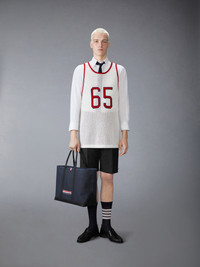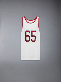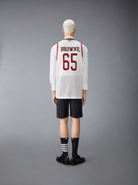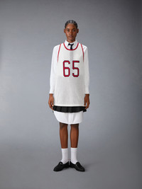 An elevated take on the classic jersey, this sporty number pays homage to heritage, craftsmanship, and athletics. The bold 65, a nod to Thom’s birth year, is rendered in an iconic collegiate font—famously used at Notre Dame. Crafted from ultra-soft mesh cashmere, it effortlessly blends tradition and modern luxury. Signature striped grosgrain loop tab Model is 6'1" (185cm), wearing size 1 100% Cotton Made in Italy MKA561A-Y2001-100