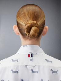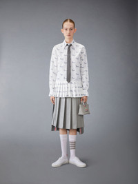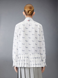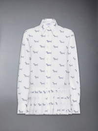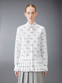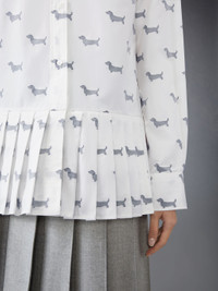 DETAILS & FIT Elevate your seasonal wardrobe with this sophisticated button-down dress shirt featuring a romantic pleated bottom that adds an elegant touch. Heralded as the most famous dog muse in fashion, Thom Browne’s very own dachshund Hector served as the inspiration behind this quintessential piece. Front button closure Pleated back yoke with locker loop Signature striped grosgrain loop tab Model is 5'10" (178 cm), wearing size 40 96% Cotton, 4% Polyester Made in Italy FLL190A-F0797-415