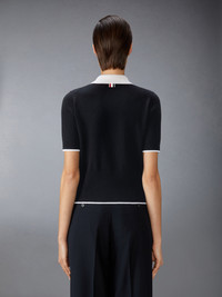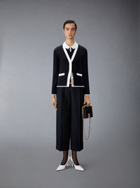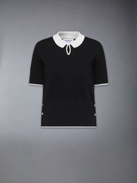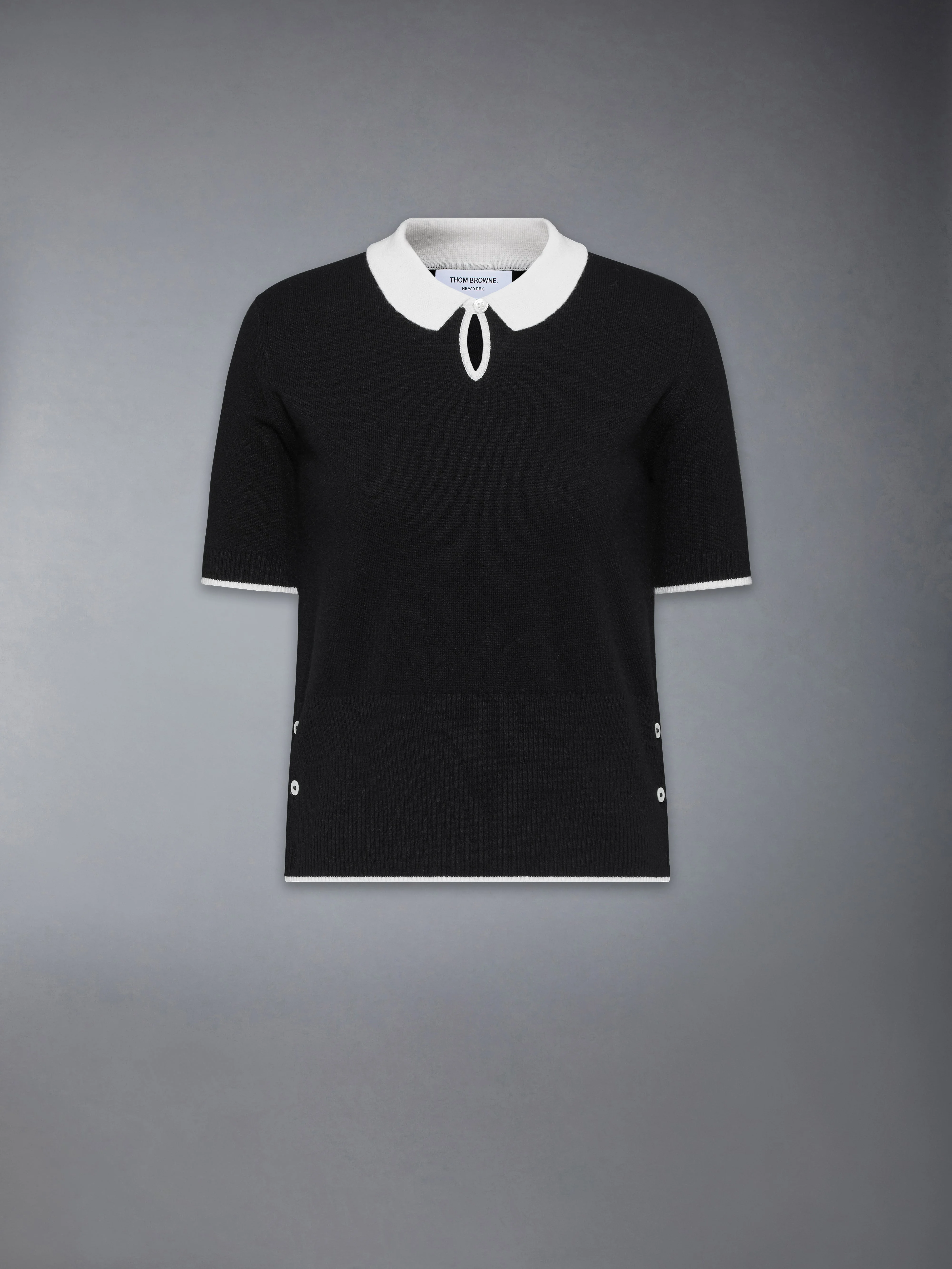Effortless, elegant, and versatile. A charming keyhole polo crafted from luxurious fabric and finished with subtle Thom Browne branding. Style it with our Uniform High Waisted Double Pleat Trouser. Keyhole at collar Buttoned side vents with signature striped grosgrain trim Signature striped grosgrain loop tab Model is 5'10" (178 cm), wearing size 40 100% Cashmere Made in Italy FKP122A-Y2001-001