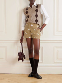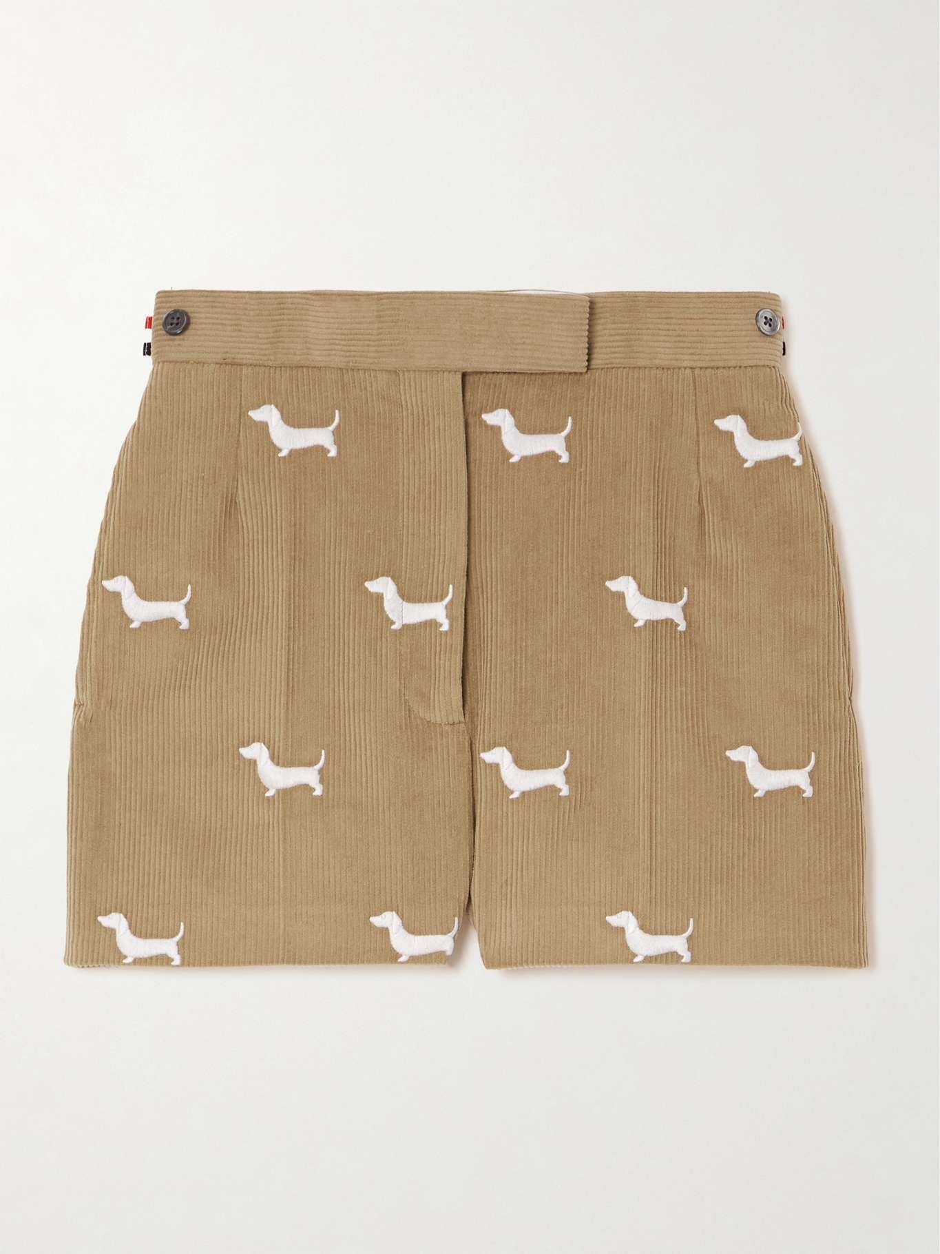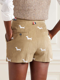 EDITORS'NOTES Thom Browne's shorts are embroidered with the designer's beloved dachshund Hector, a somewhat unlikely style icon who's featured in so many of the brand's collections. They're cut from soft cotton-corduroy and have side tabs to cinch the waist. SIZE & FIT Model measurements: - Fits true to size, however those who are between sizes should take the larger size - Mid-rise, intended for a slim fit - Mid-weight, non-stretchy fabric - Model is 177cm/ 5'10" and is wearing an IT 40 - Bust: 81cm/ 32" - Waist: 62cm/ 24.5" - Hip: 89cm/ 35" DETAILS & CARE - Sand cotton-corduroy - Concealed button and zip fastening at front - 100% cotton - Dry clean - Mother-of-pearl: Indonesia