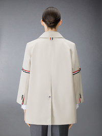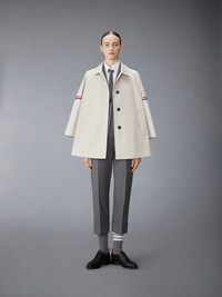 Cropped car coat in waterproof khaki cotton twill with striped grosgrain armbands. 3-button closure, notched lapels, slant welt pockets. Cropped sleeves with buttoned cuffs and striped grosgrain trim. Buttoned single back vent. Gingham lining with interior pocket and name tag. Signature striped grosgrain loop tab at back of neck. Model is 5'10"; (178 cm), wearing size 40 59% Polyester, 28% Cotton, 13% Polyurethane Made in Italy FOC704O-06111-250