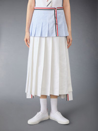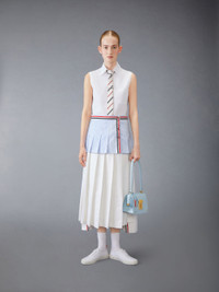DETAILS & FIT Crafted from airy madras cotton and adorned with signature Thom Browne emblems, this ultra-mini pleated skirt exudes both playful energy and timeless style. Versatile and fun, it can be layered over one of our signature dress shirts or worn on its own for a bold statement. Front button closure Dropped back hem with signature striped grosgrain trim Signature striped grosgrain loop tab Model is 5'10" (178 cm), wearing size 40 100% Cotton Made in Italy FGCA27U-F0810-480