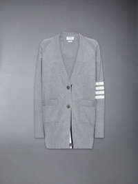 Exaggerated fit V-neck cardigan in light grey jersey stitch cotton with 4-bar stripe detail at left sleeve in white. Front button closure with striped grosgrain placket. 2 patch front pockets. Raglan sleeves with ribbed seam. Buttoned side vents and cuffs with signature striped grosgrain trim. Signature striped grosgrain loop tab at back of neck. Model is 5'10"; (178 cm), wearing size 40 100% Cotton Made in Italy FKC424A-Y3007-055